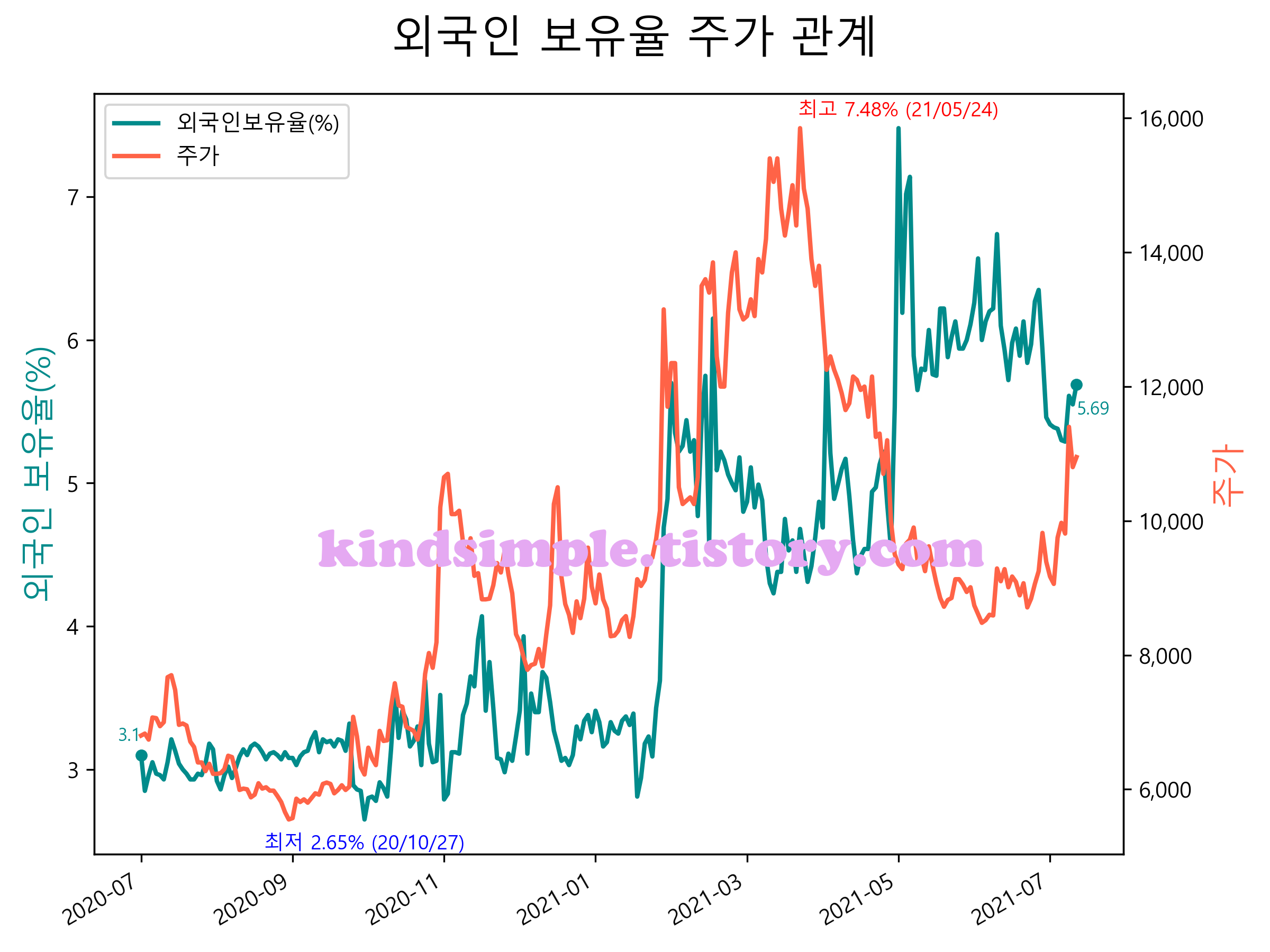 최근 1년간 외국인 보유율 및 주가와의 관계입니다.