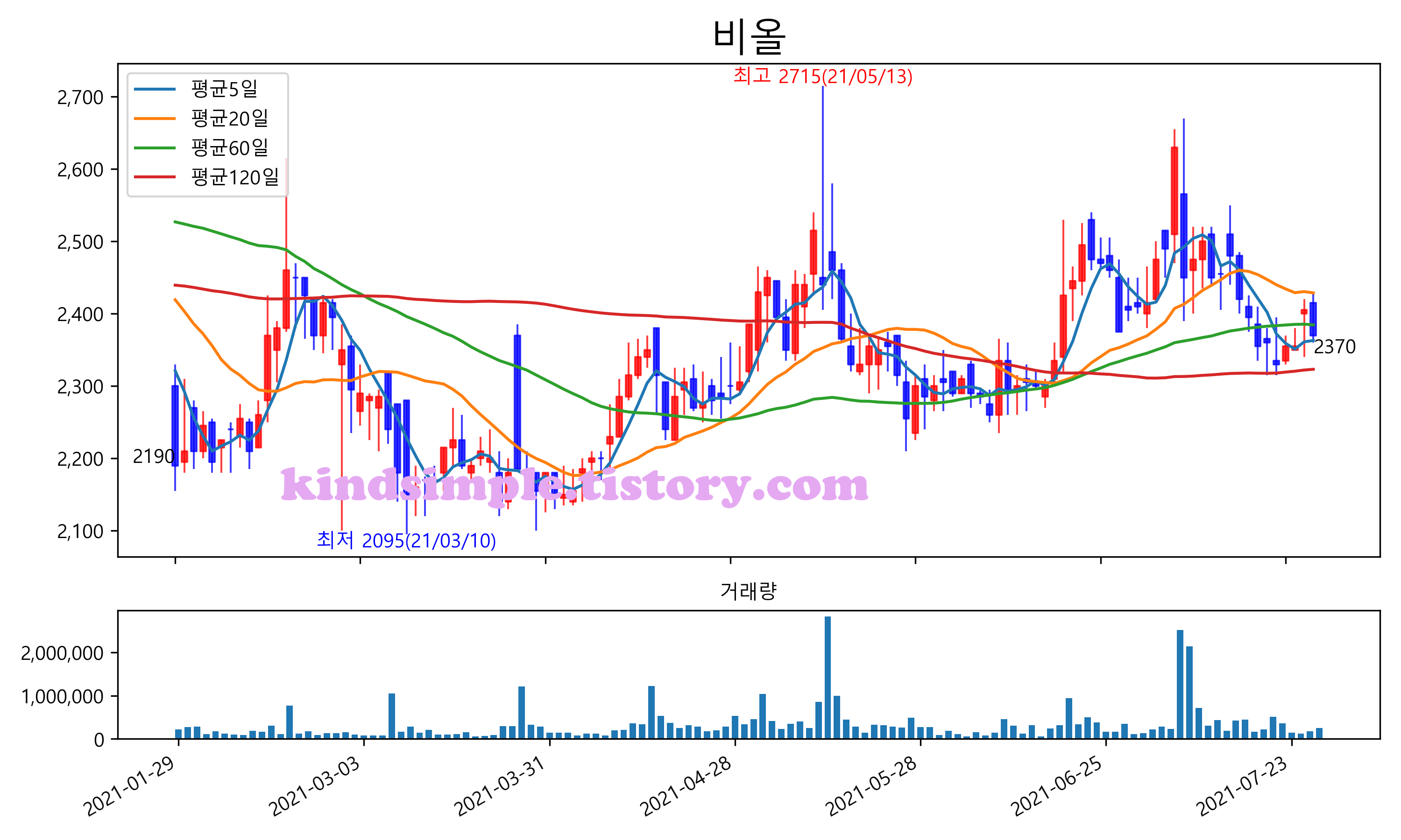 최근 6개월간 캔들차트 및 이동평균선입니다.