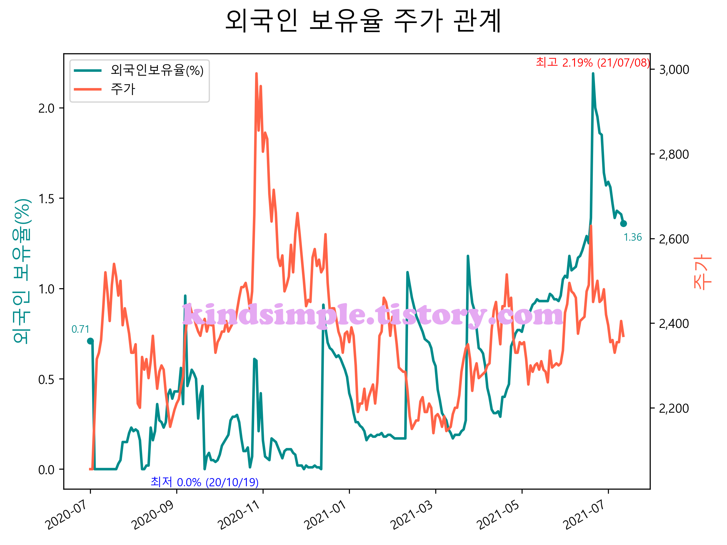 최근 1년간 외국인 보유율 및 주가와의 관계입니다.