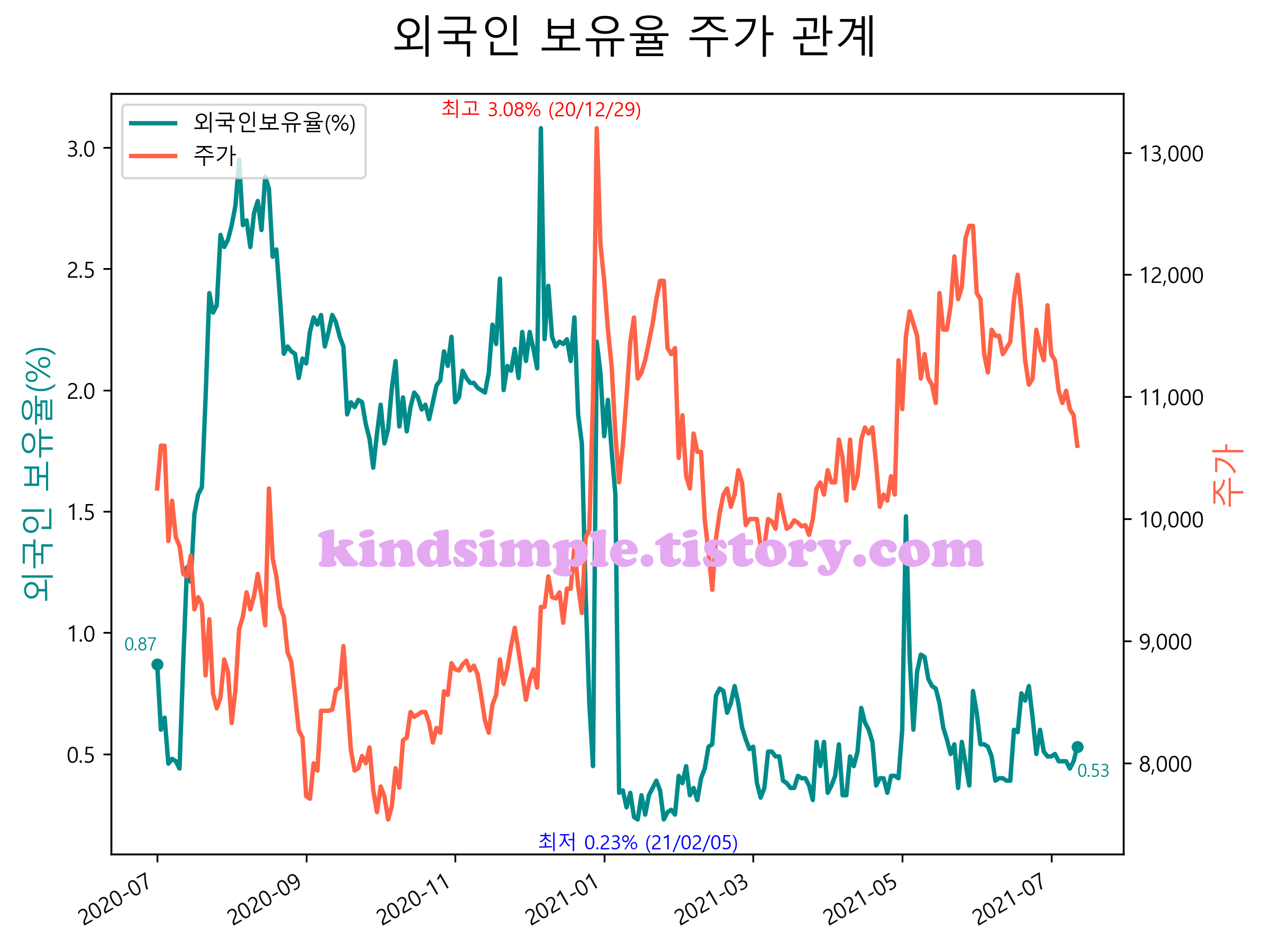 최근 1년간 외국인 보유율 및 주가와의 관계입니다.