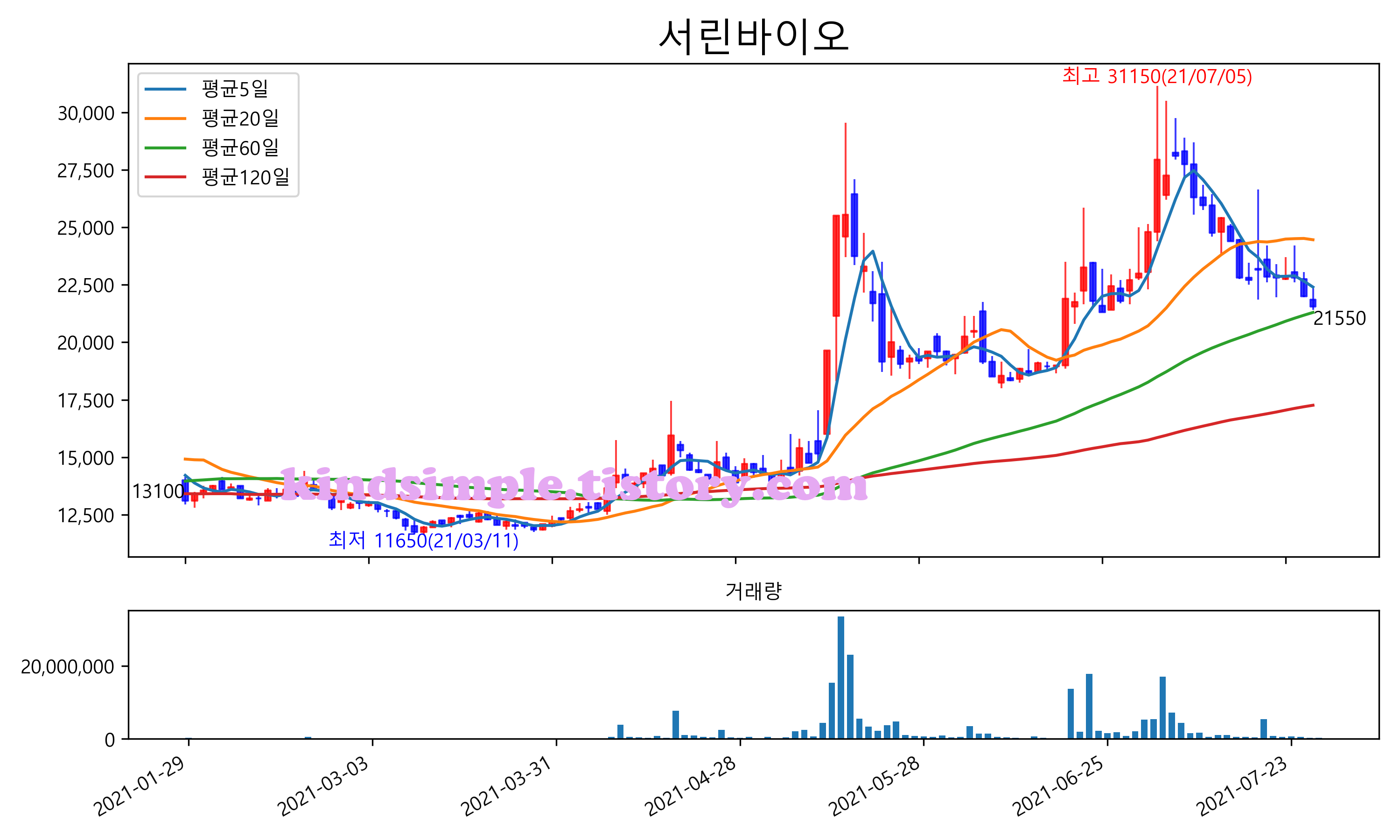 최근 6개월간 캔들차트 및 이동평균선입니다.