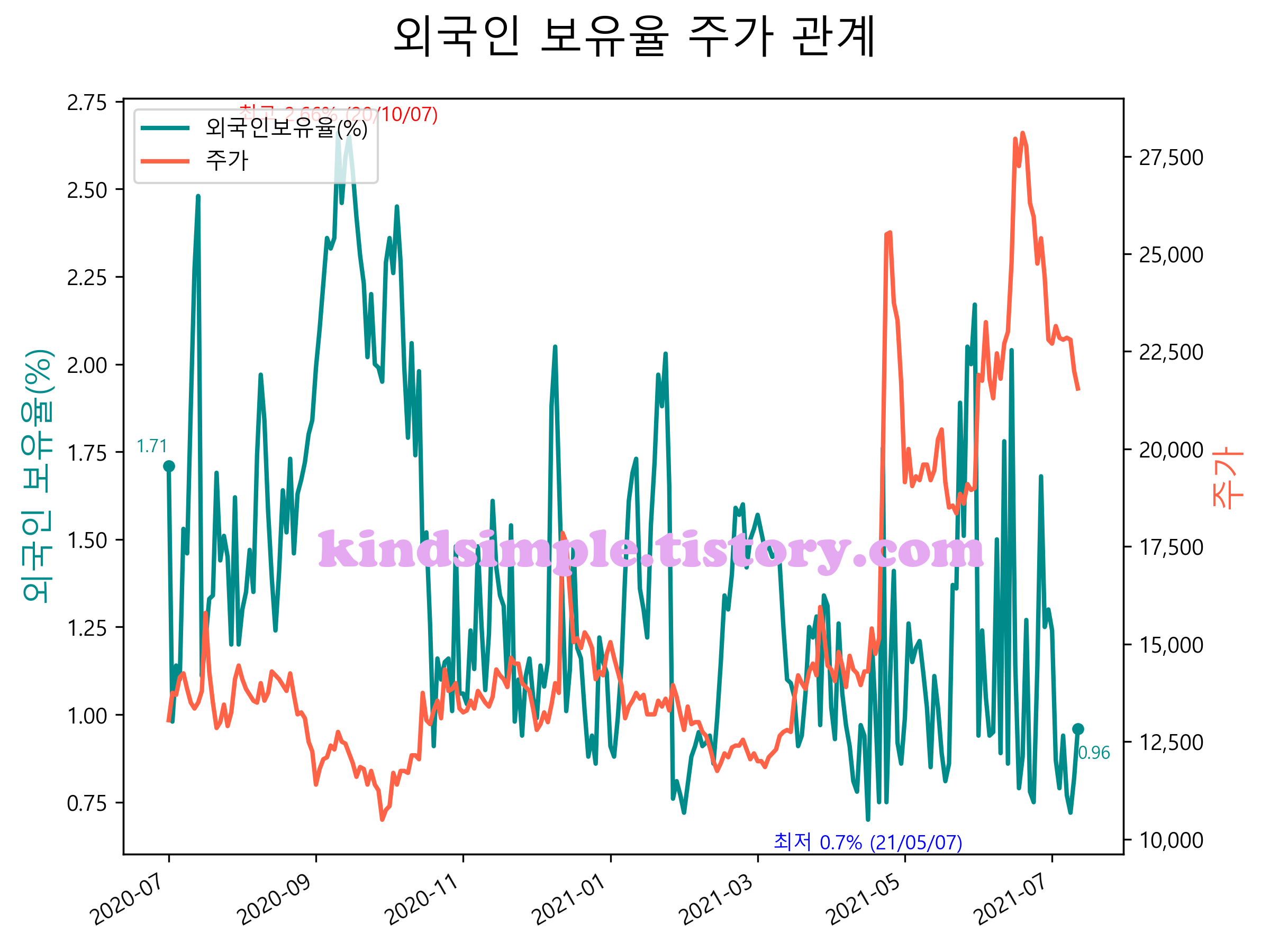 최근 1년간 외국인 보유율 및 주가와의 관계입니다.