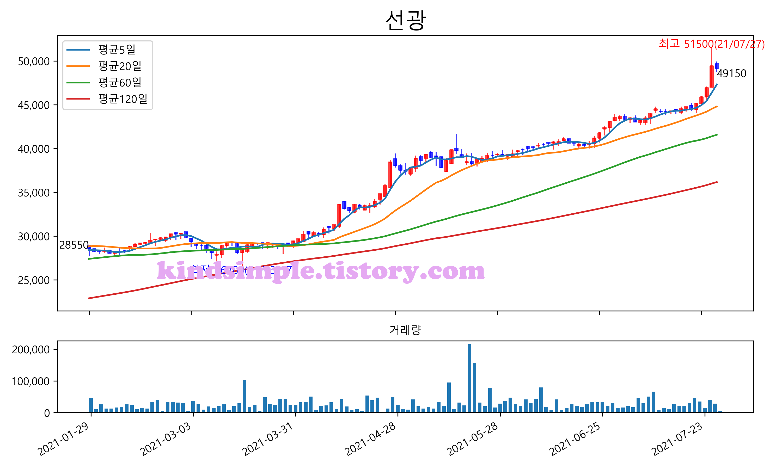 최근 6개월간 캔들차트 및 이동평균선입니다.