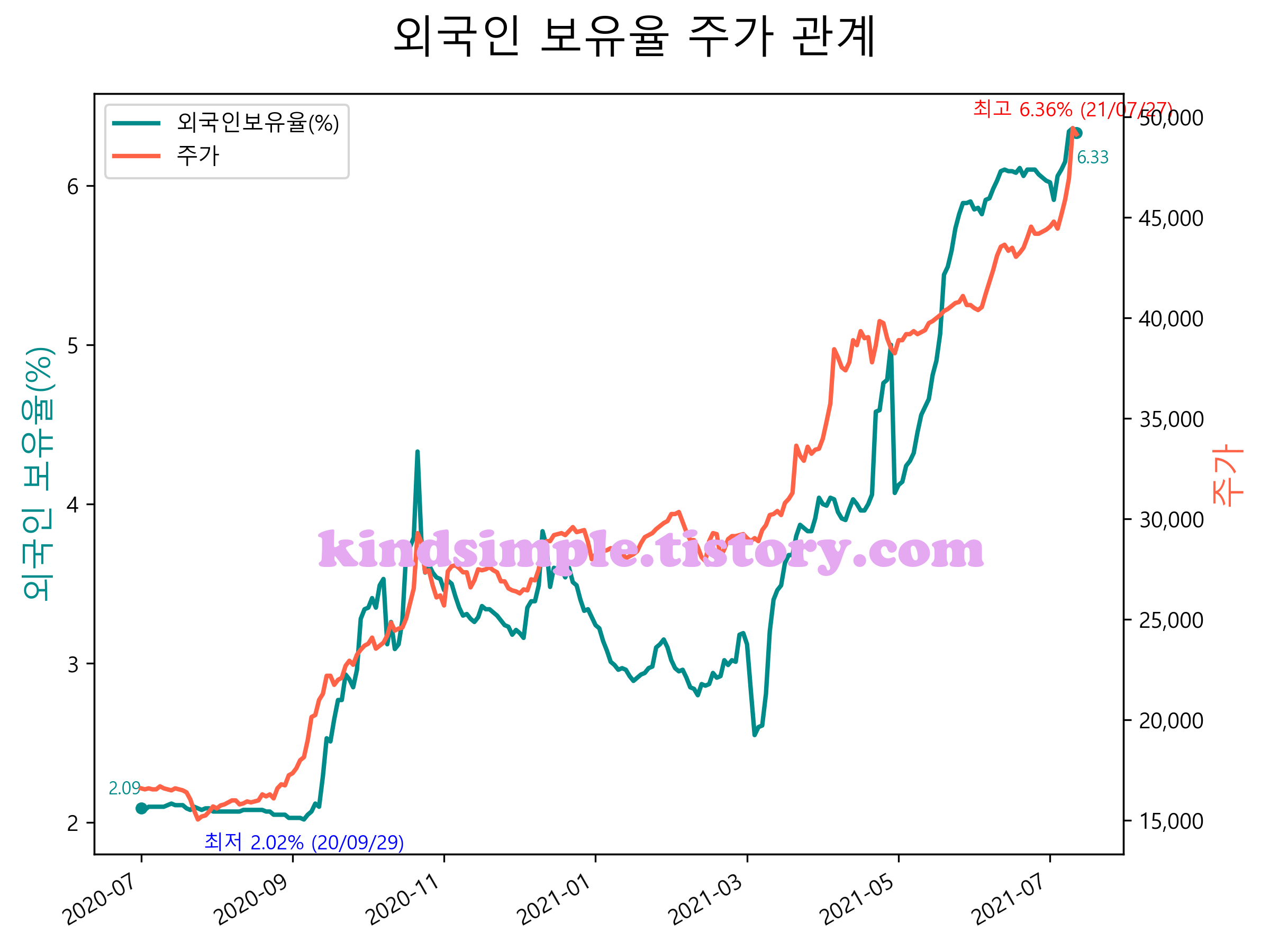 최근 1년간 외국인 보유율 및 주가와의 관계입니다.