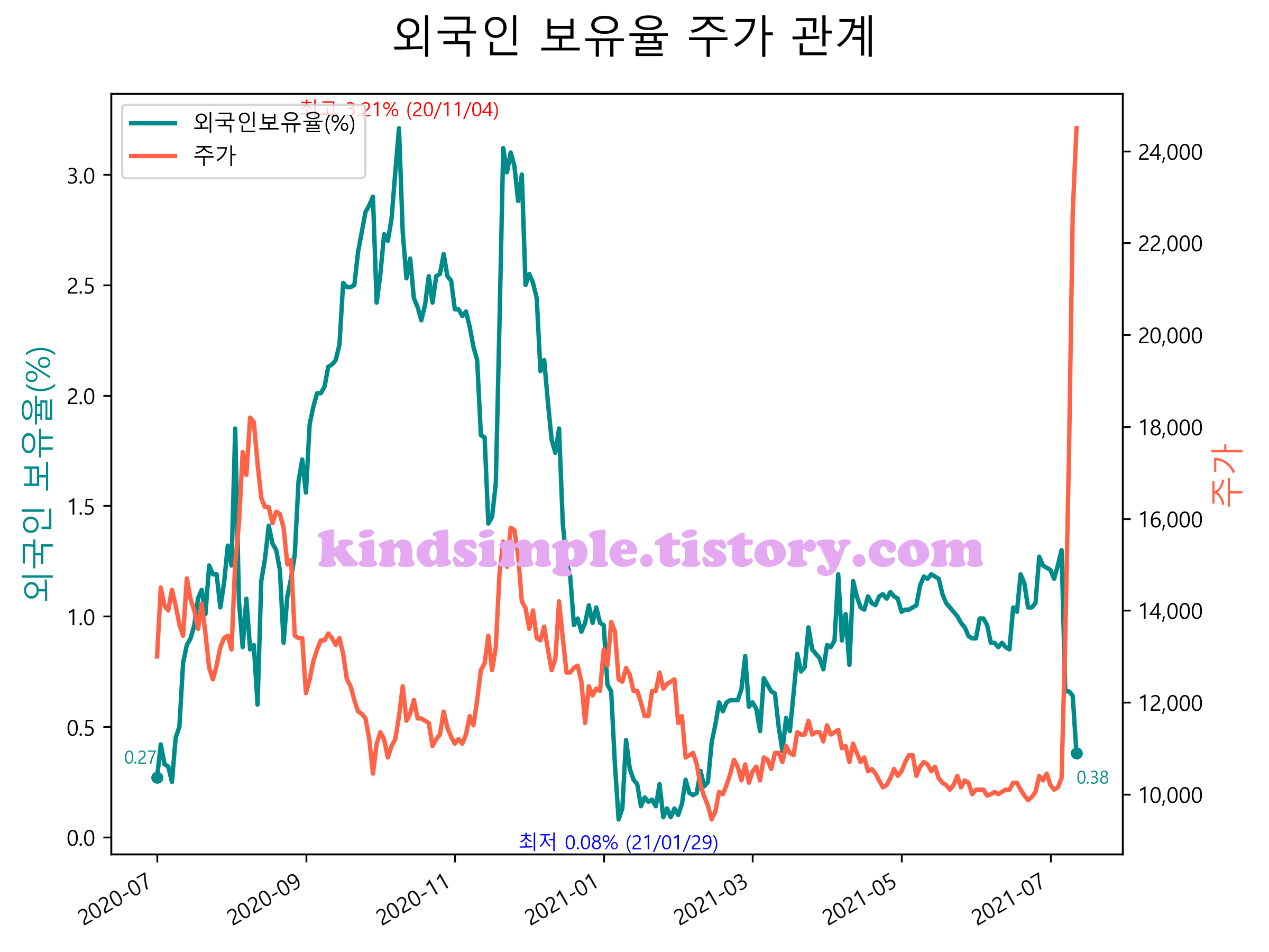 최근 1년간 외국인 보유율 및 주가와의 관계입니다.