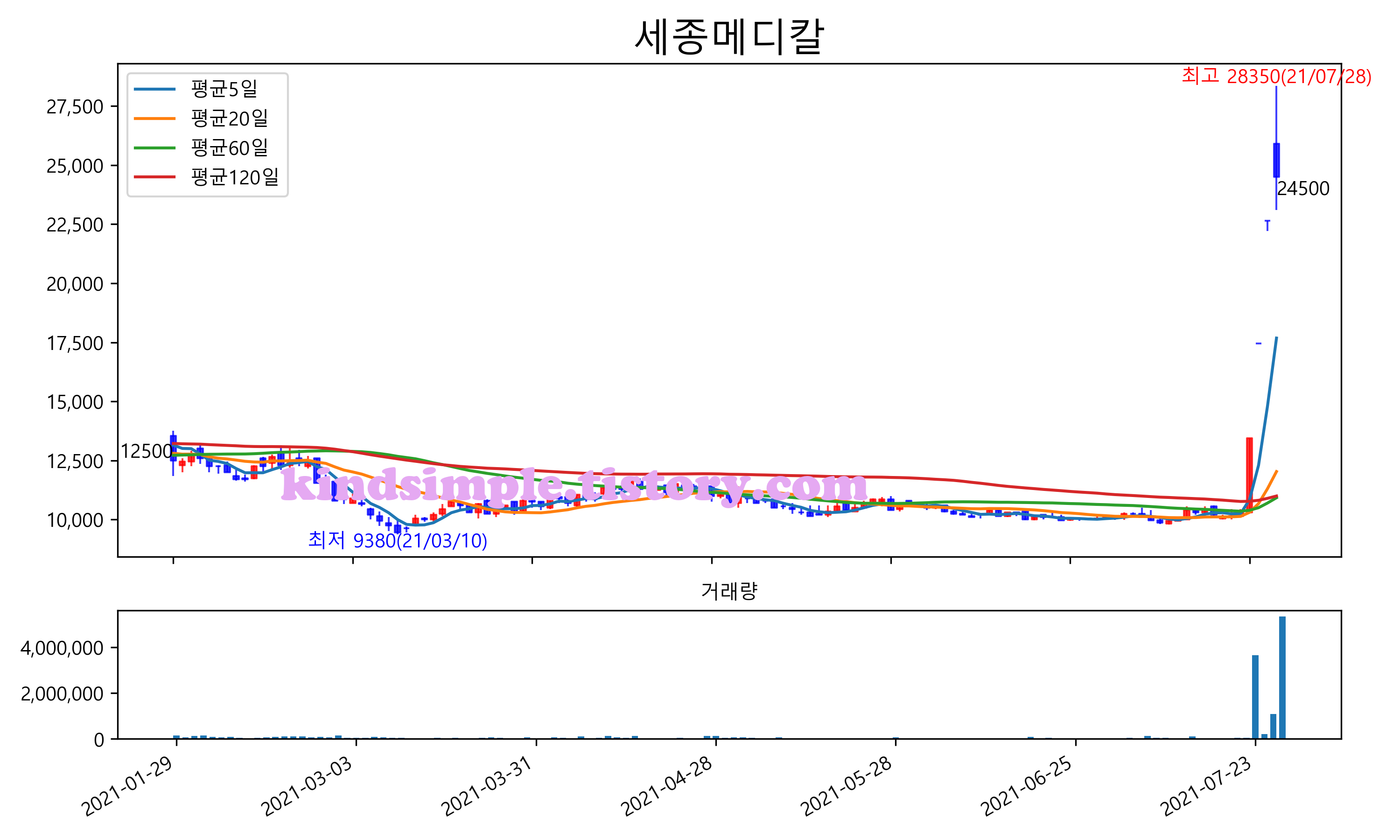 최근 6개월간 캔들차트 및 이동평균선입니다.
