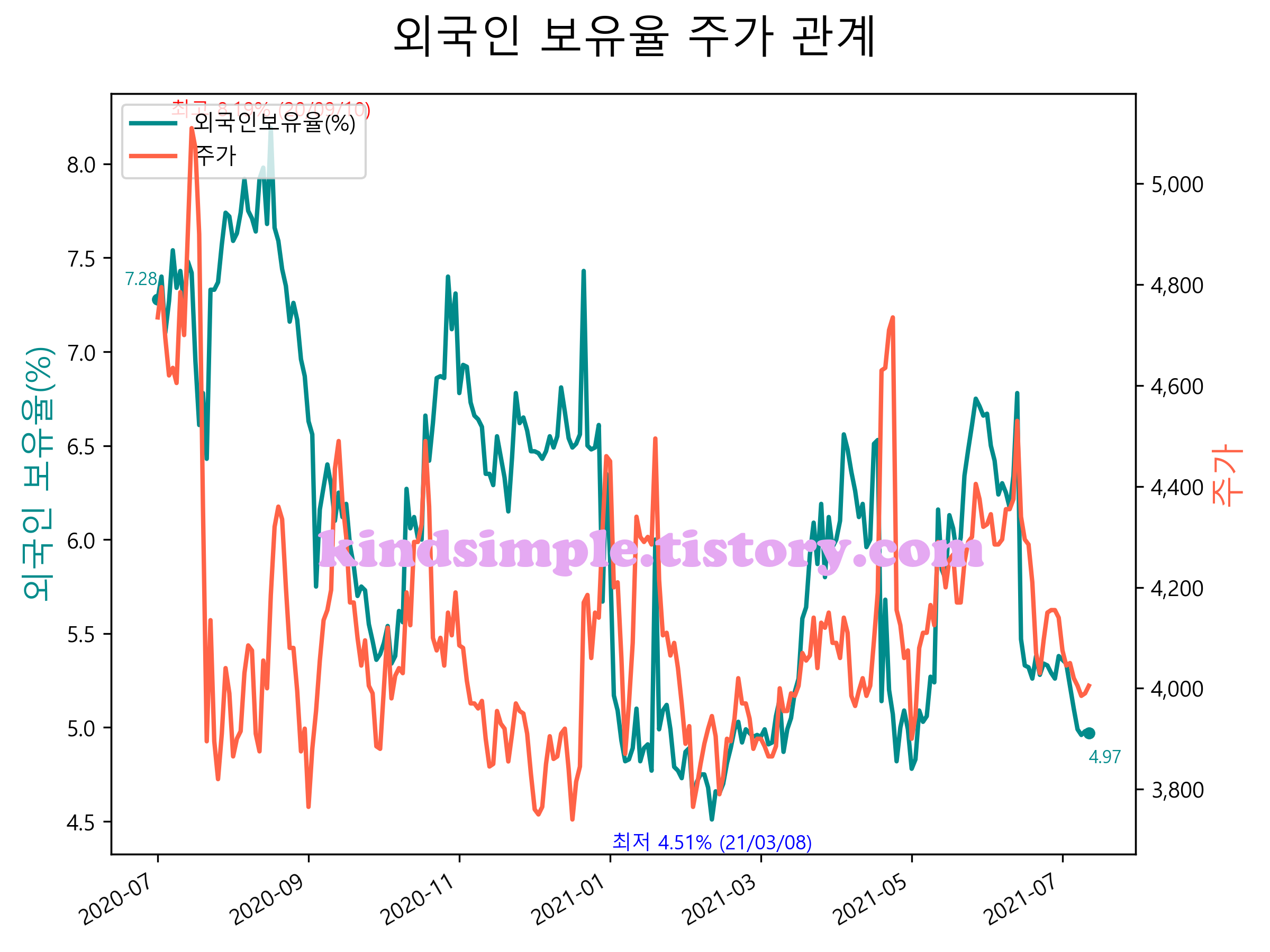 최근 1년간 외국인 보유율 및 주가와의 관계입니다.