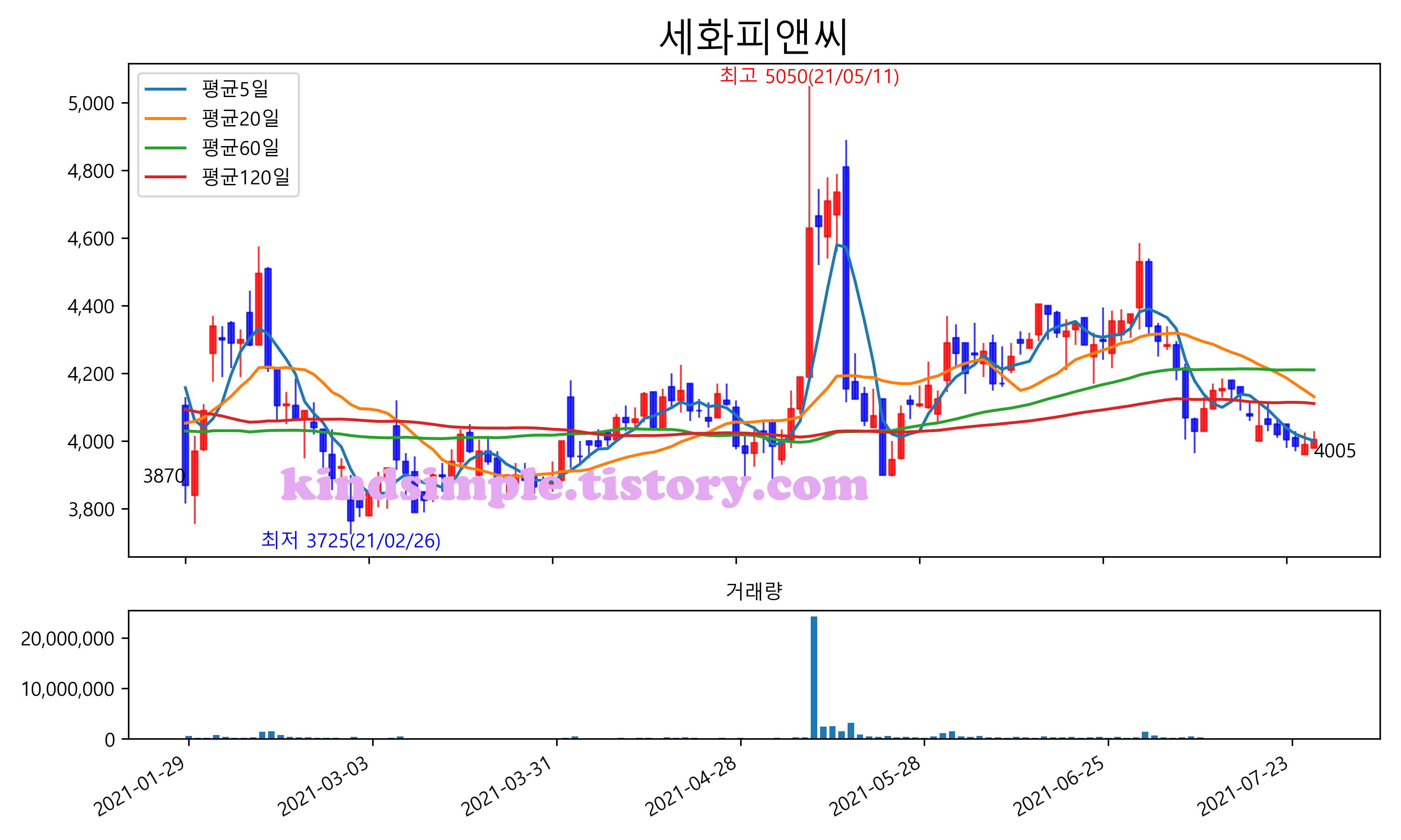 최근 6개월간 캔들차트 및 이동평균선입니다.