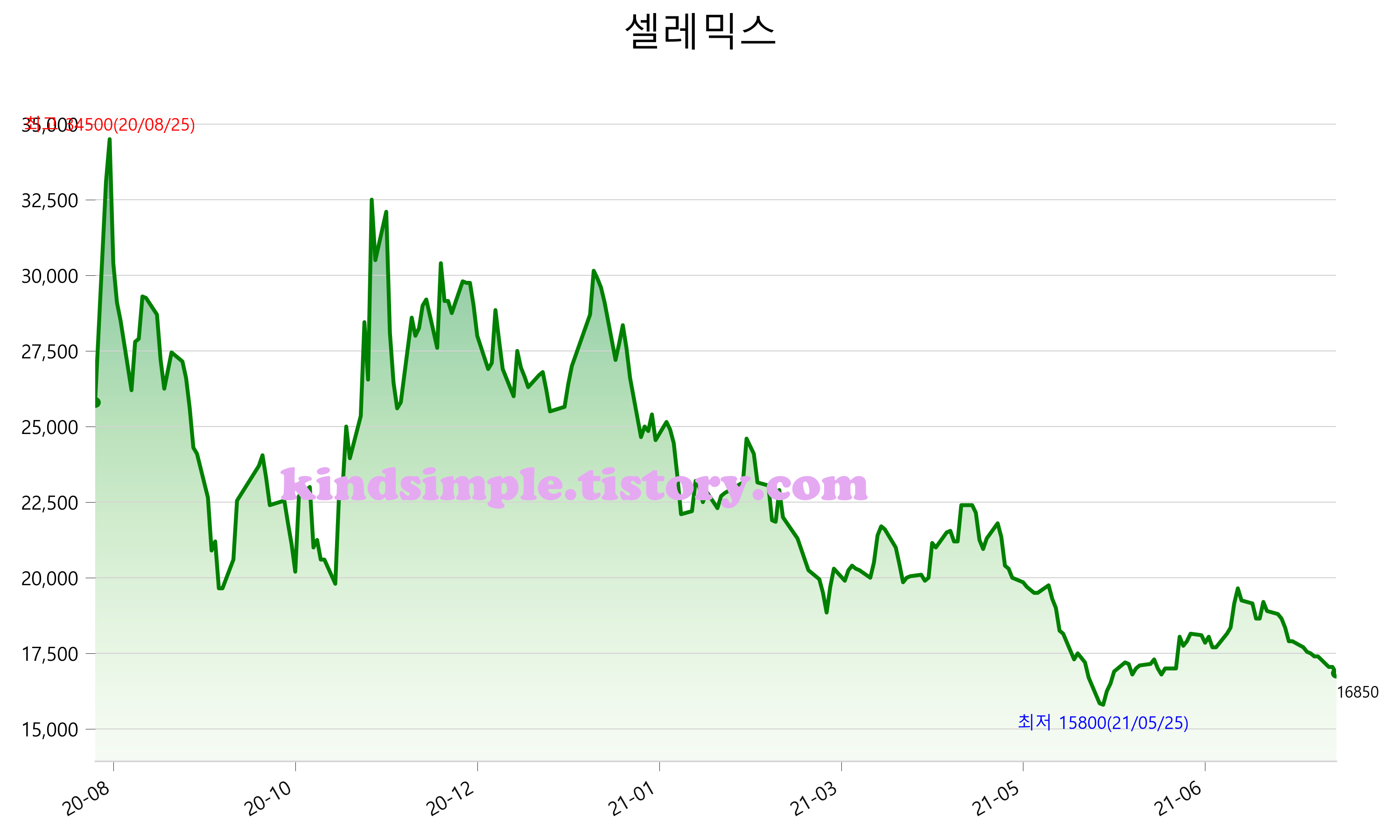 52주 최고가는 34,500원(2020-08-25), 52주 최저가는 15,800원(2021-05-25)으로 52주간 변동률은 -34.7% 입니다.