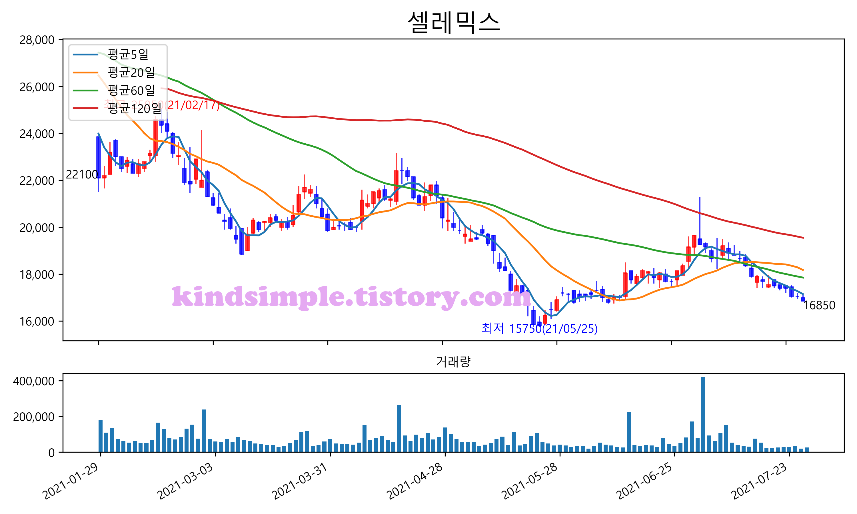 최근 6개월간 캔들차트 및 이동평균선입니다.