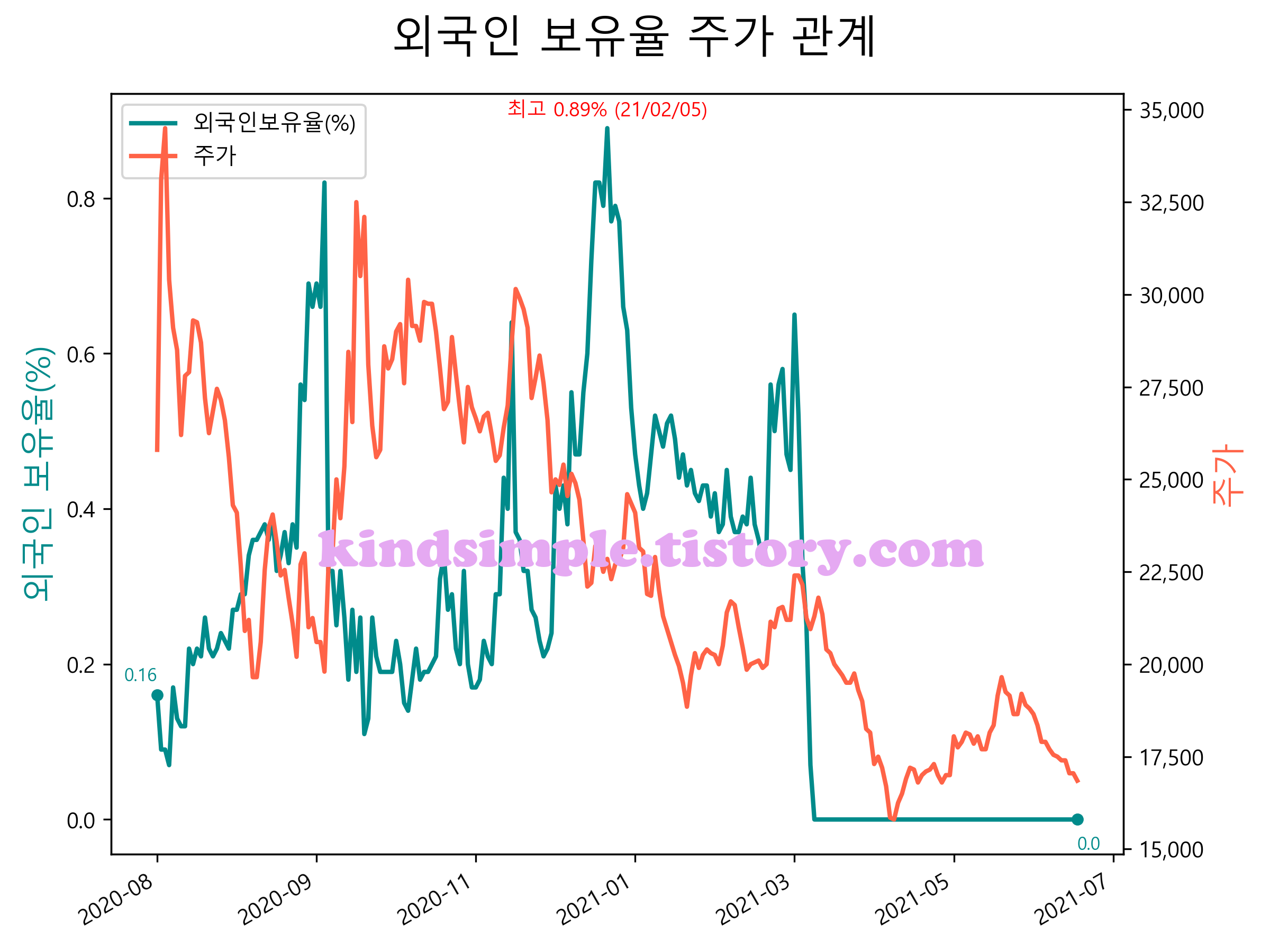 최근 1년간 외국인 보유율 및 주가와의 관계입니다.