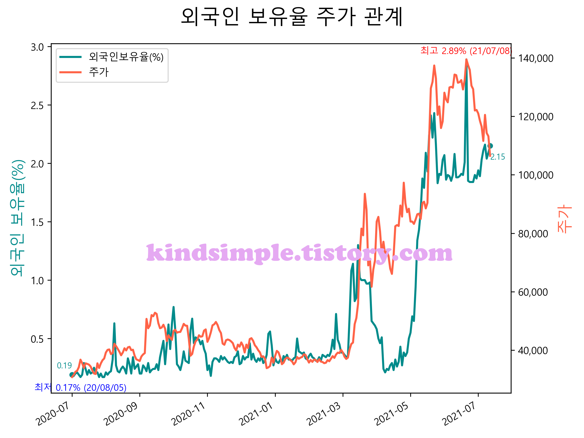 최근 1년간 외국인 보유율 및 주가와의 관계입니다.