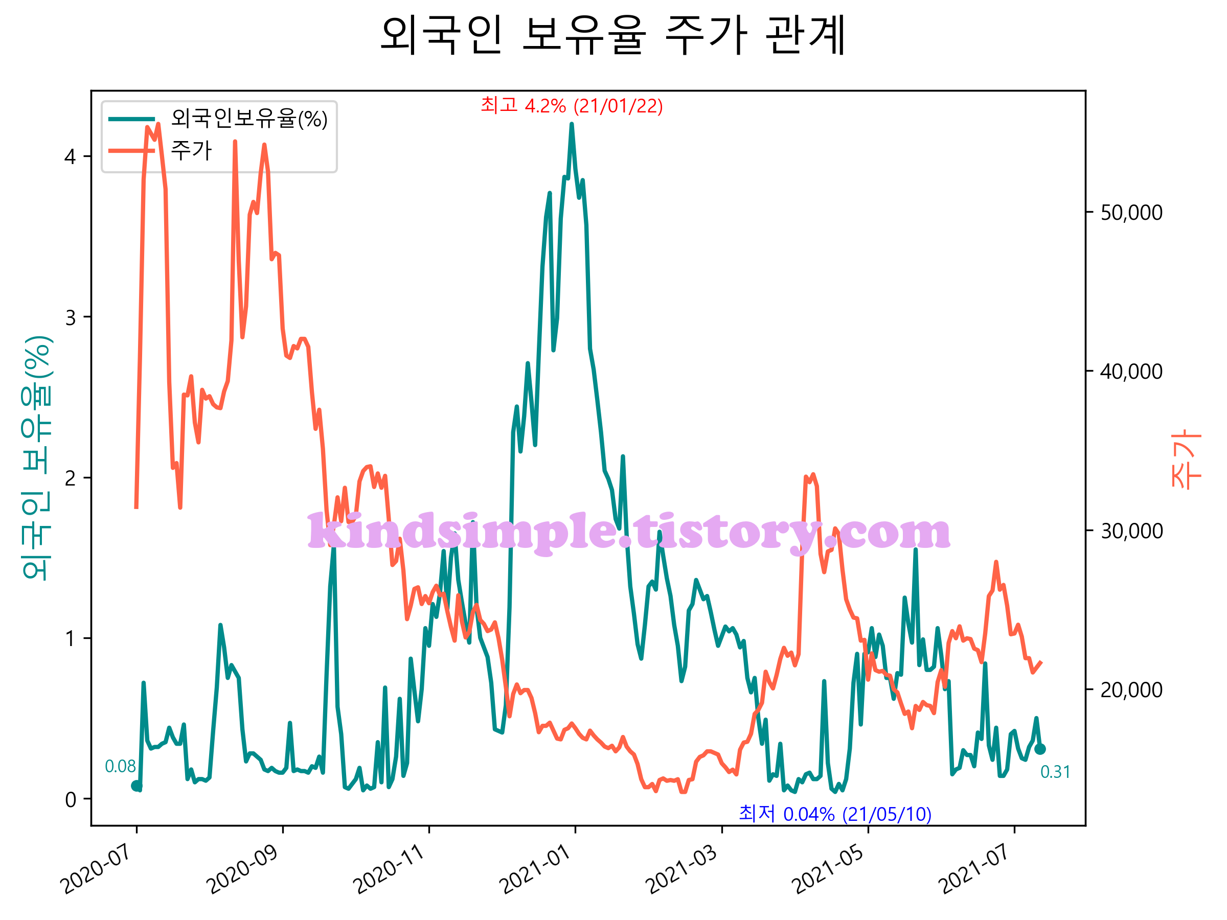 최근 1년간 외국인 보유율 및 주가와의 관계입니다.