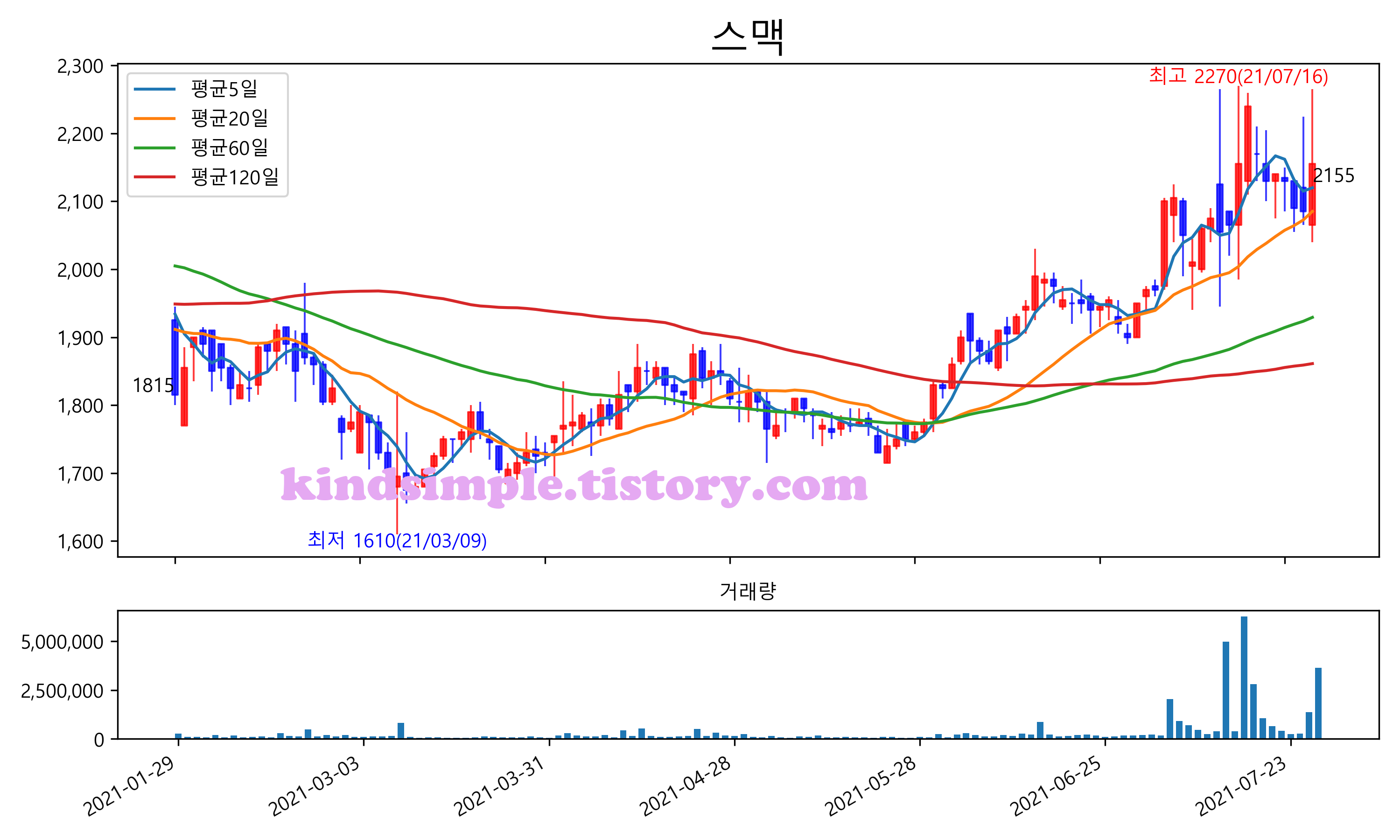 최근 6개월간 캔들차트 및 이동평균선입니다.