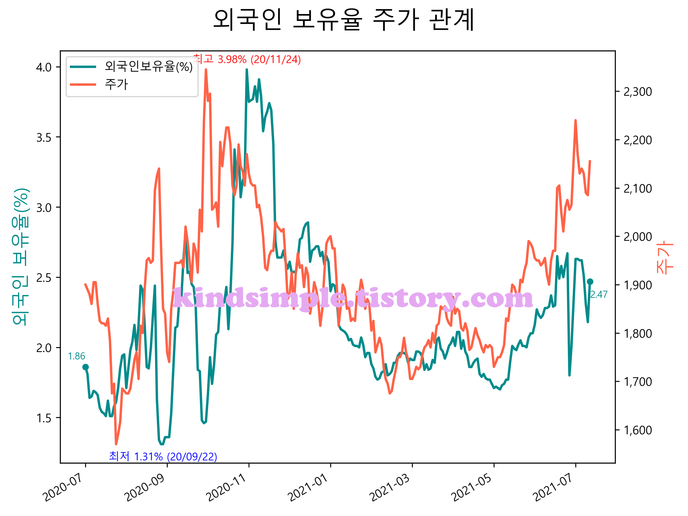 최근 1년간 외국인 보유율 및 주가와의 관계입니다.