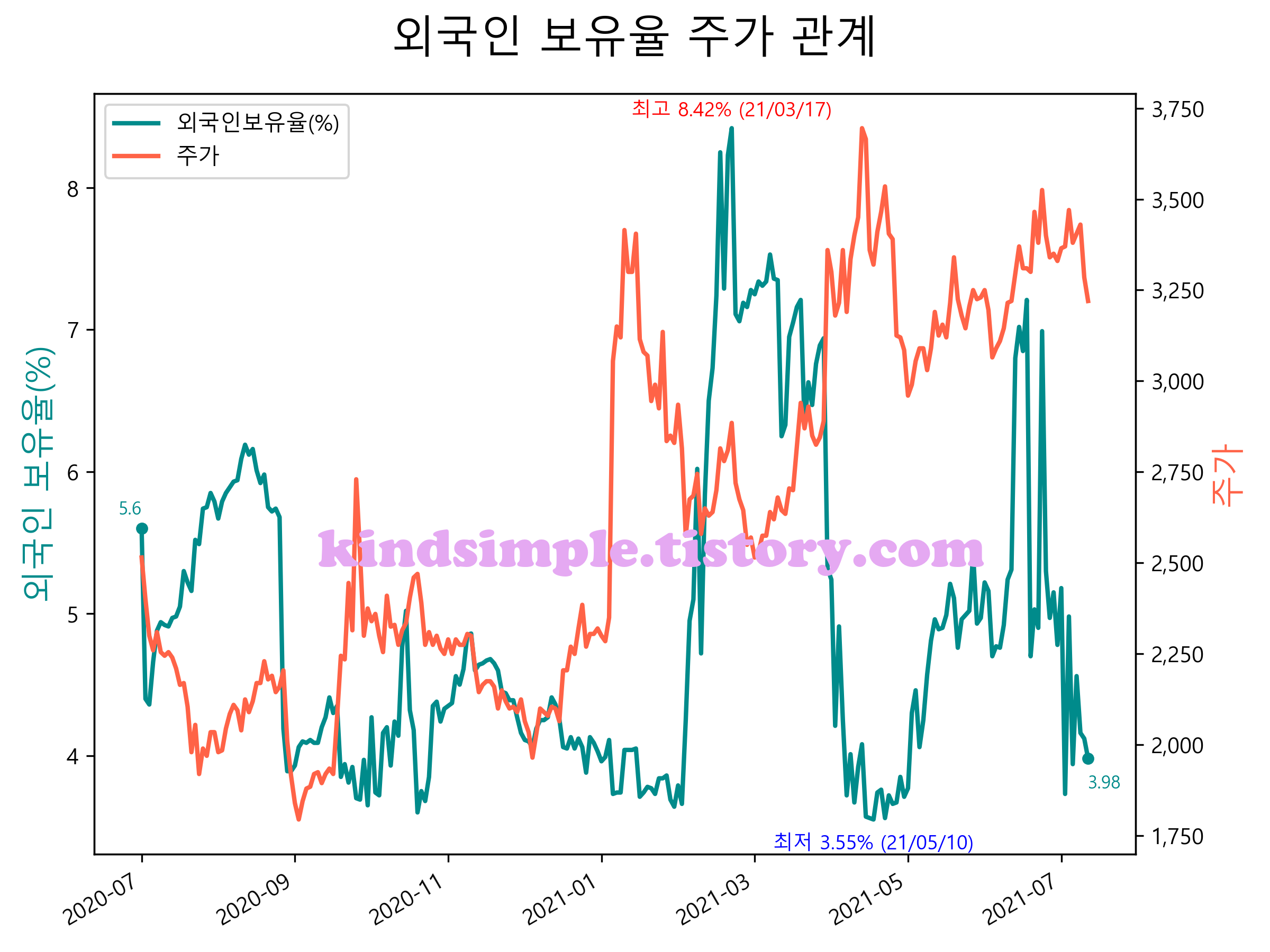 최근 1년간 외국인 보유율 및 주가와의 관계입니다.