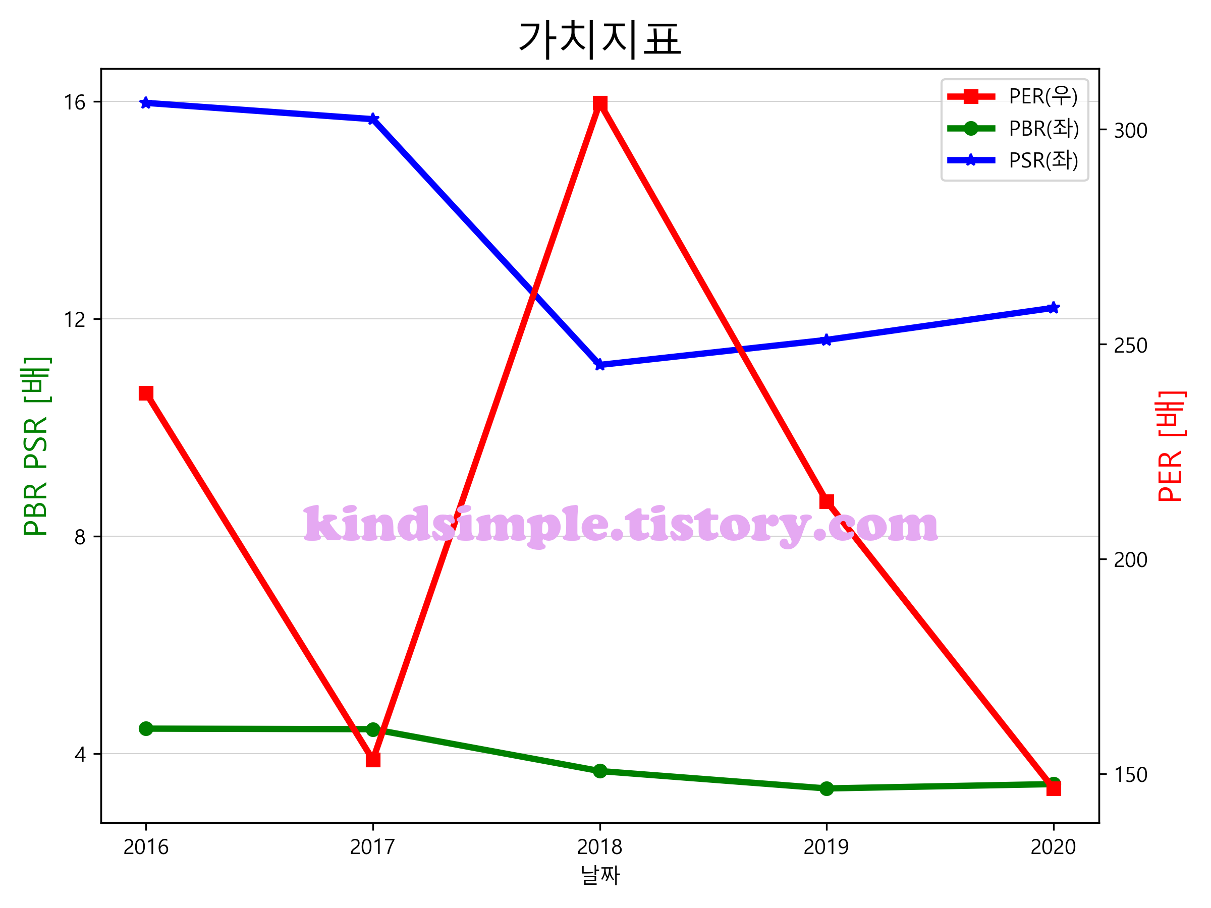 - PER : 178.89배, 동일업종 PER : 12.59배