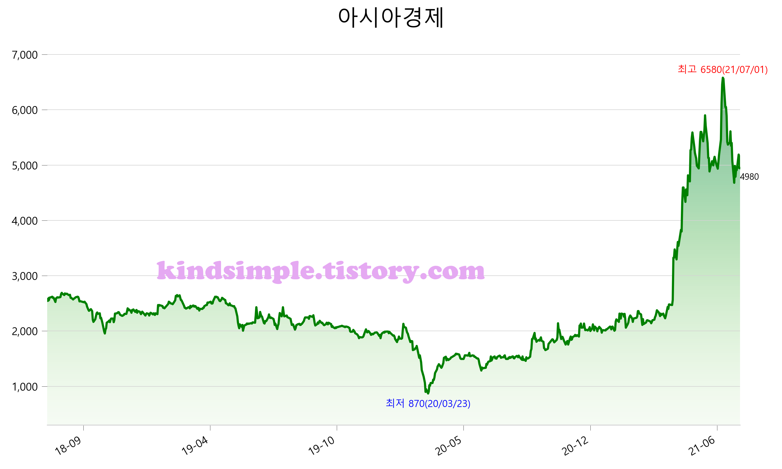 7월 29일 기준 주가는 4,980원 입니다. 아래는 최근 3년간의 주가흐름입니다.