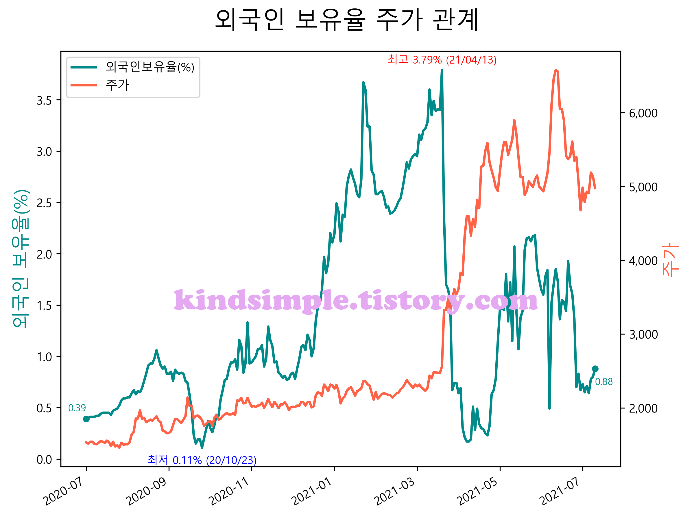 최근 1년간 외국인 보유율 및 주가와의 관계입니다.