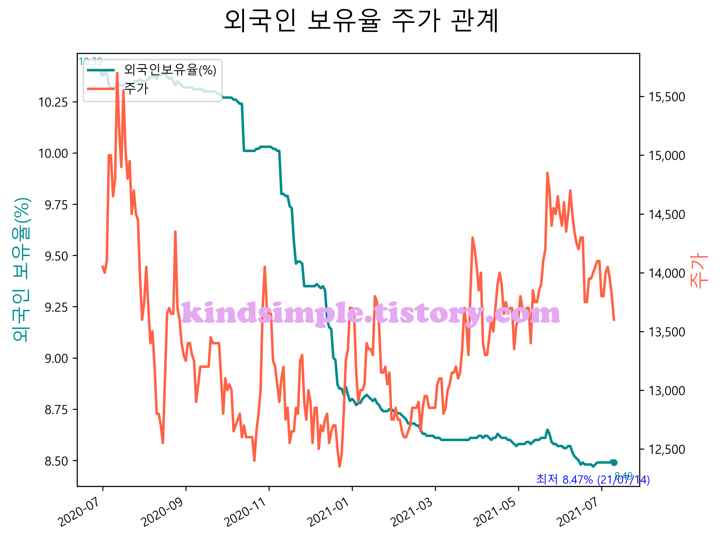 최근 1년간 외국인 보유율 및 주가와의 관계입니다.
