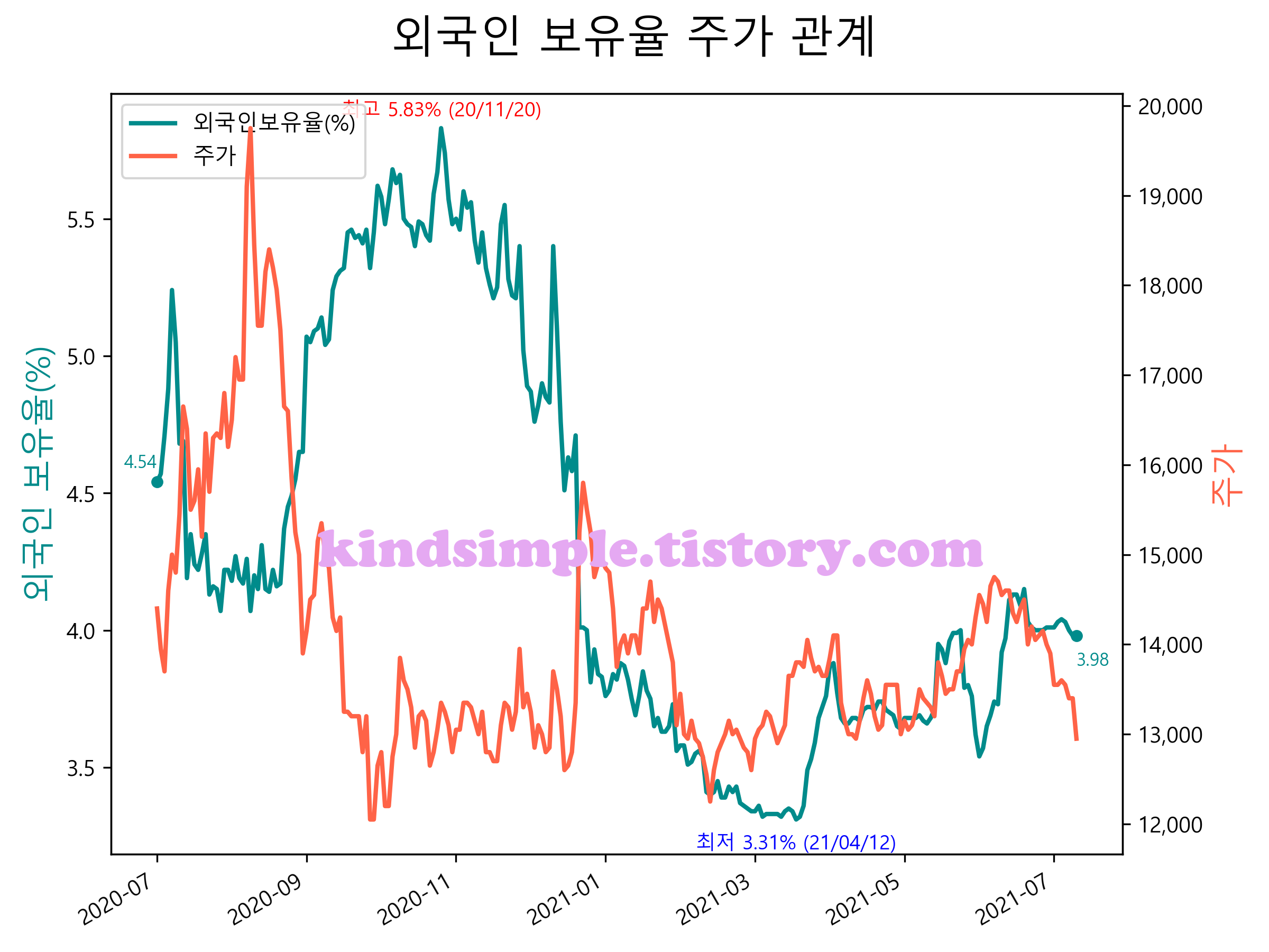 최근 1년간 외국인 보유율 및 주가와의 관계입니다.