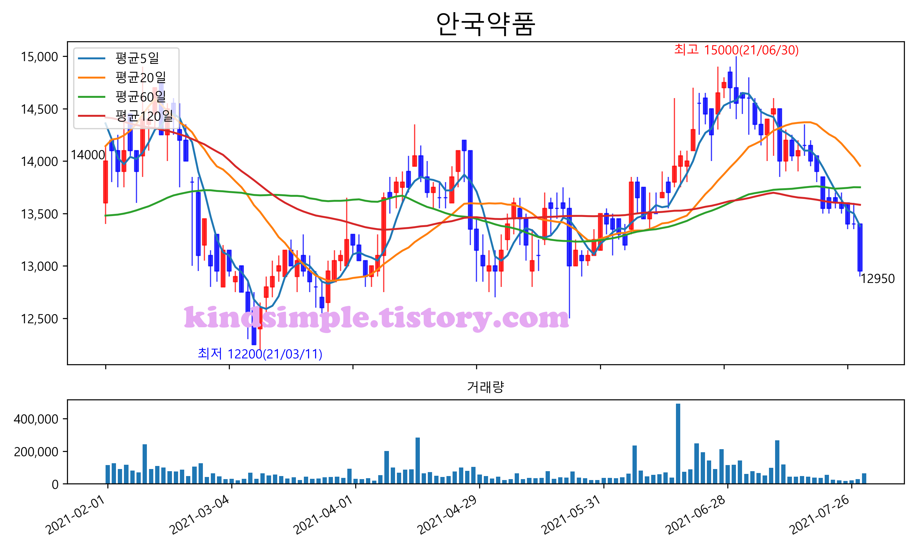 최근 6개월간 캔들차트 및 이동평균선입니다.