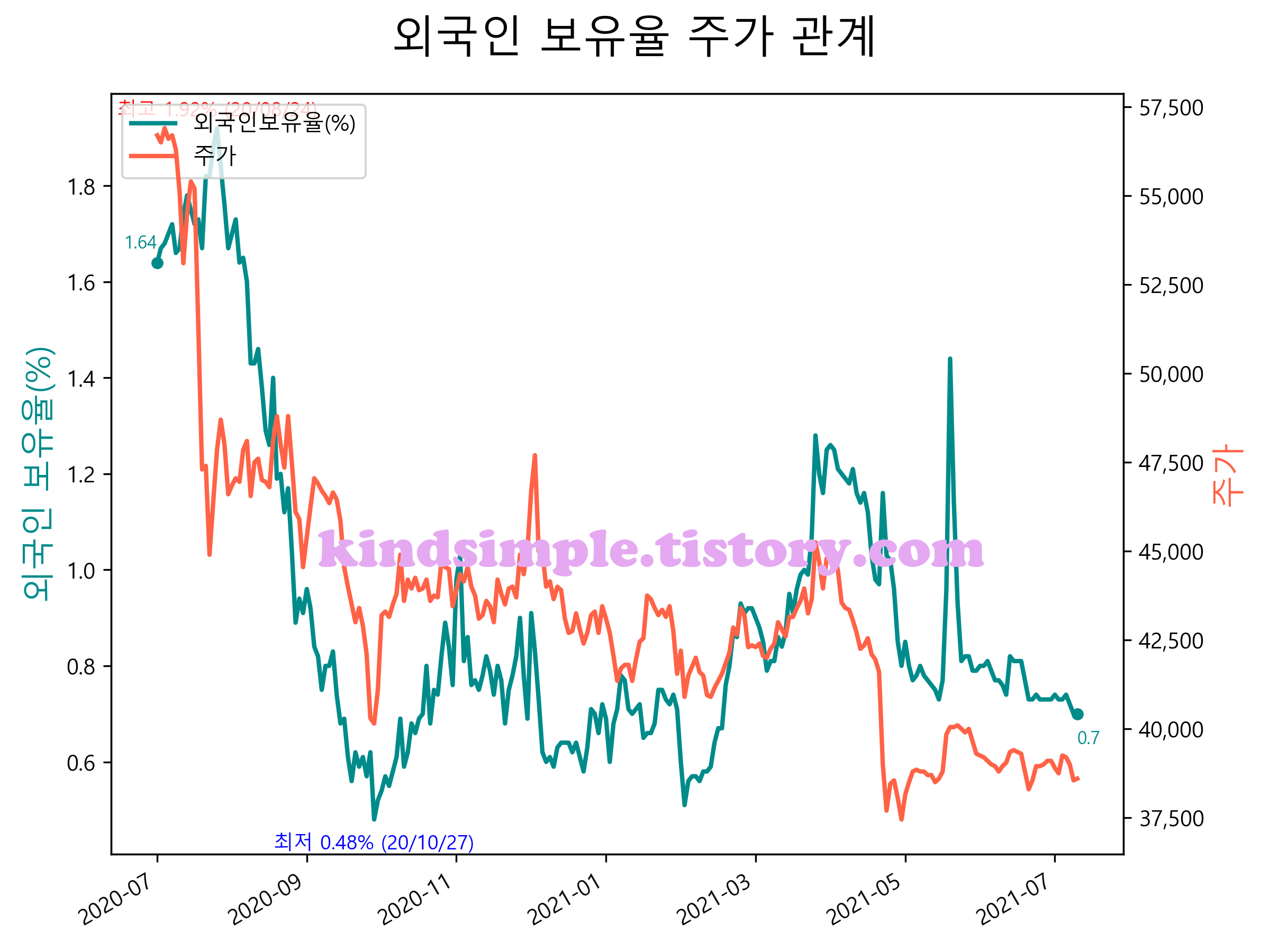 최근 1년간 외국인 보유율 및 주가와의 관계입니다.