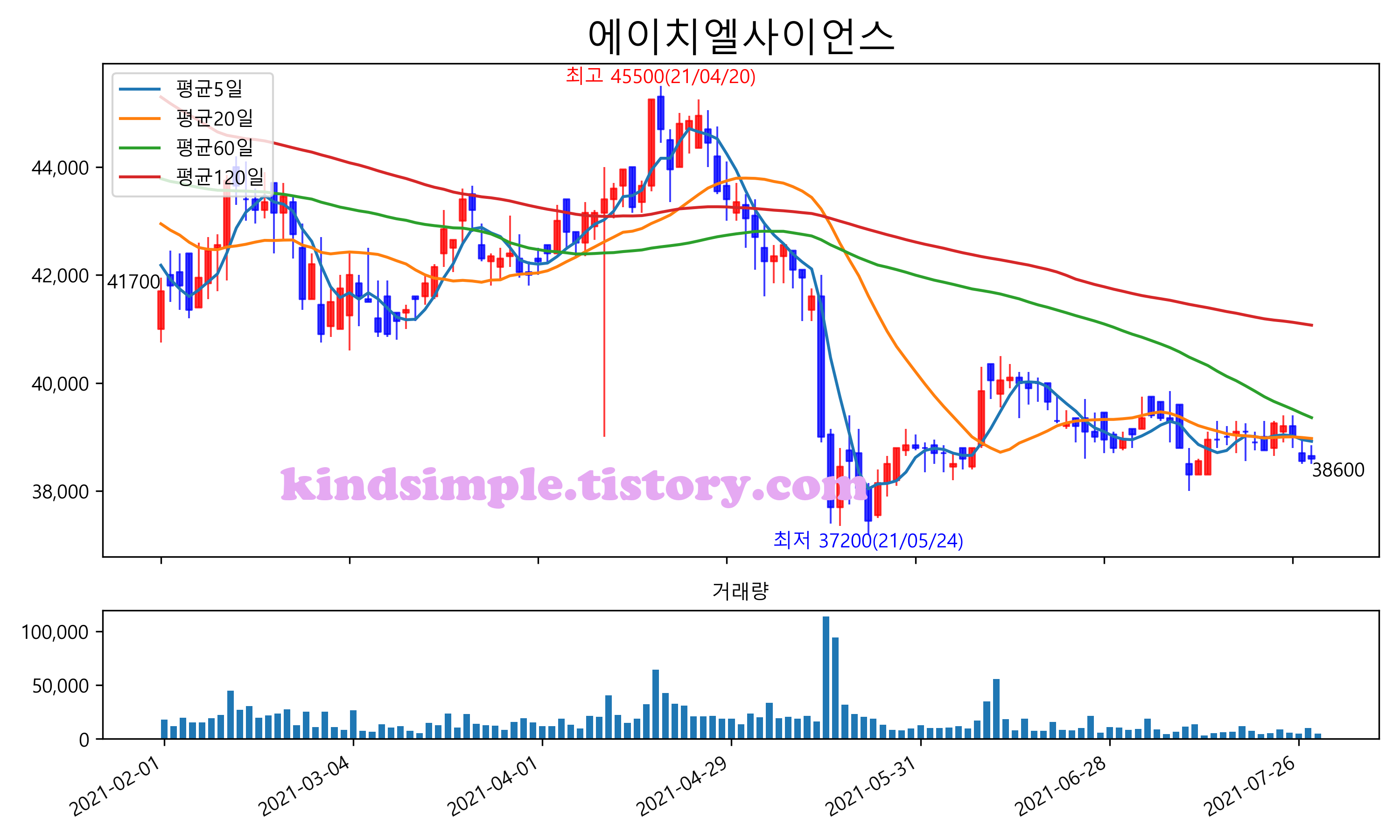 최근 6개월간 캔들차트 및 이동평균선입니다.