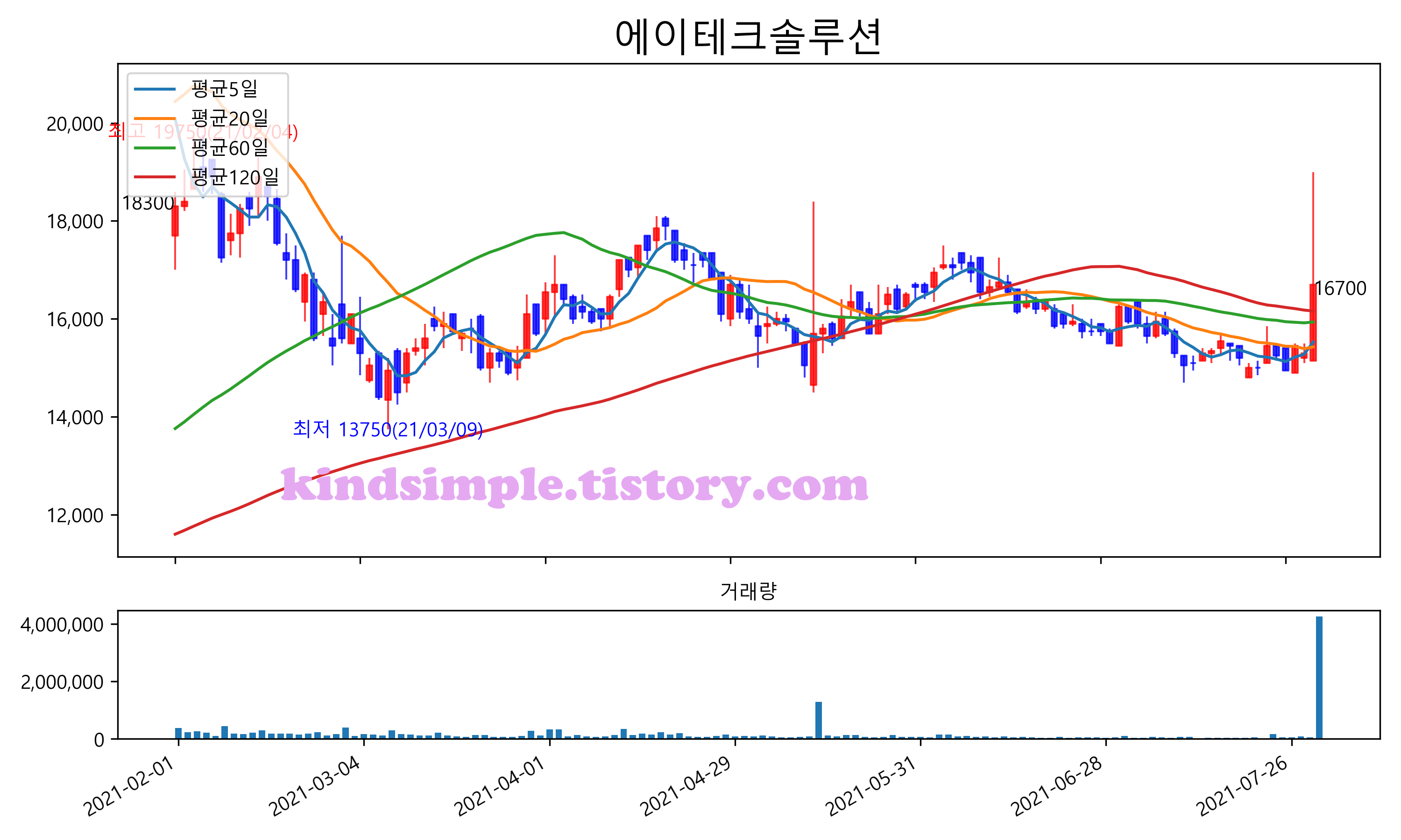 최근 6개월간 캔들차트 및 이동평균선입니다.