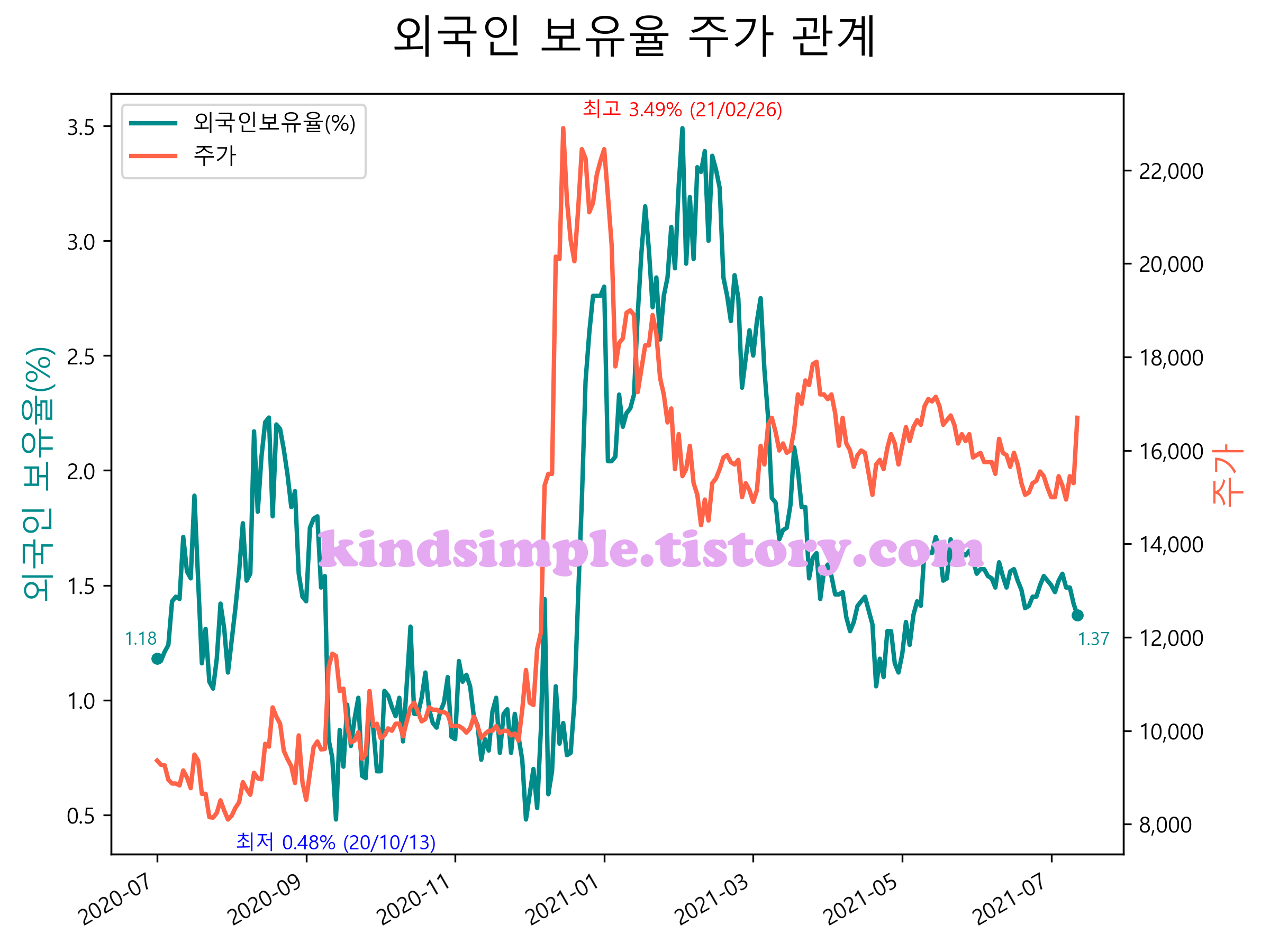 최근 1년간 외국인 보유율 및 주가와의 관계입니다.