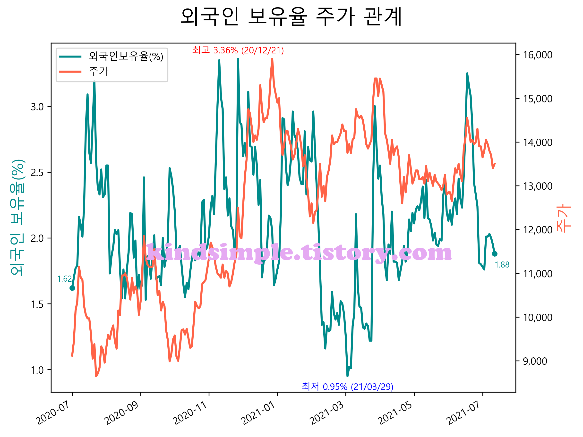 최근 1년간 외국인 보유율 및 주가와의 관계입니다.