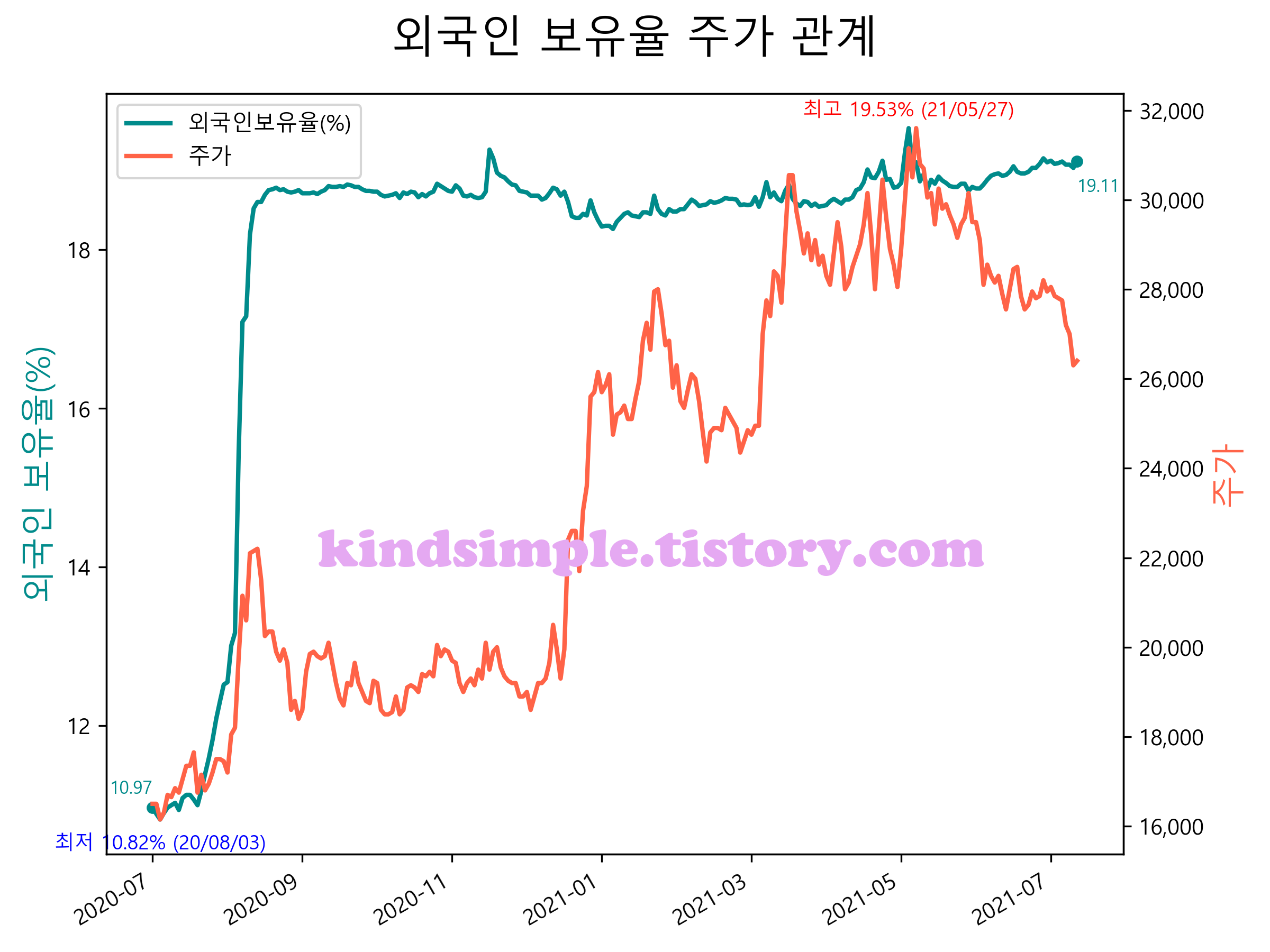 최근 1년간 외국인 보유율 및 주가와의 관계입니다.