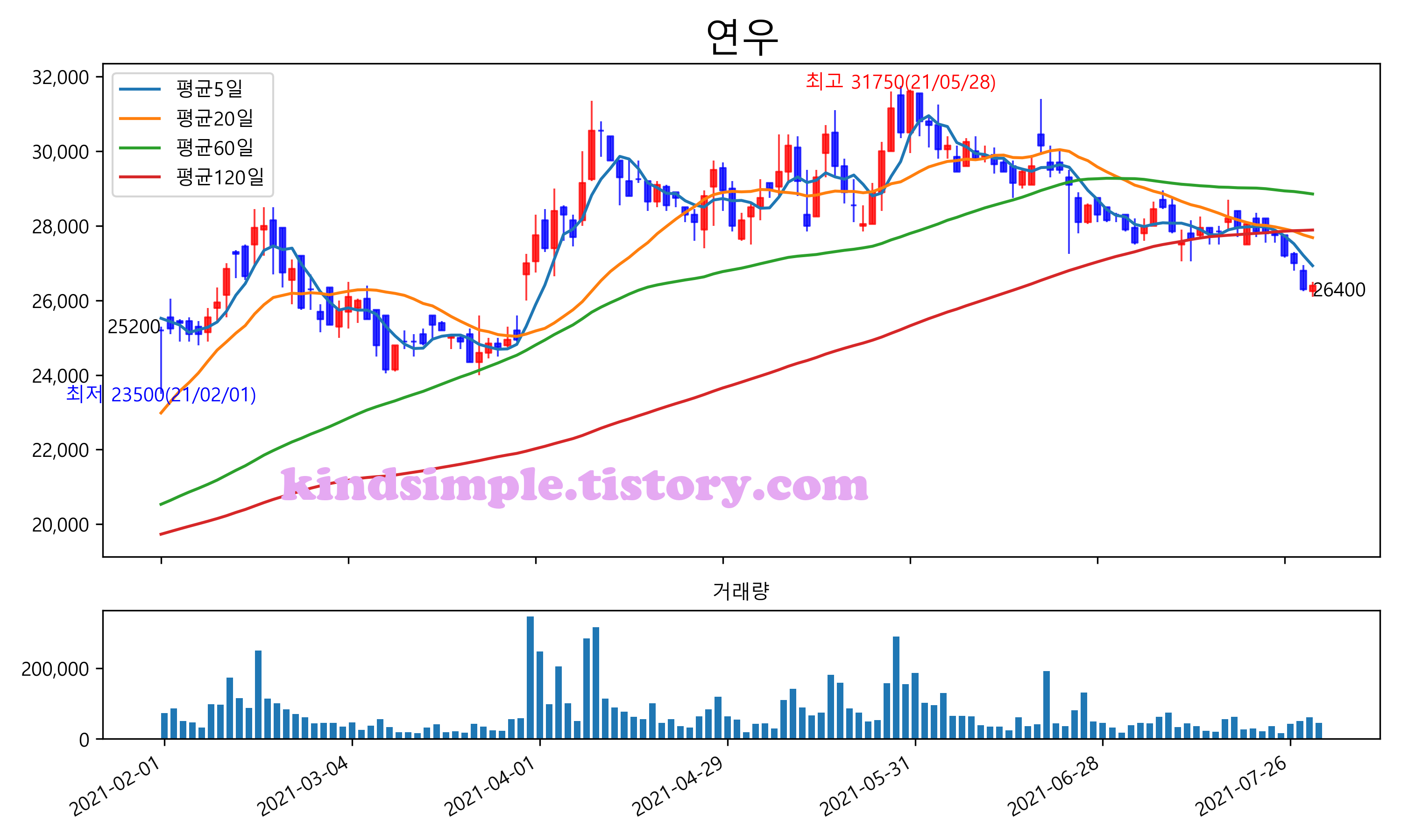 최근 6개월간 캔들차트 및 이동평균선입니다.