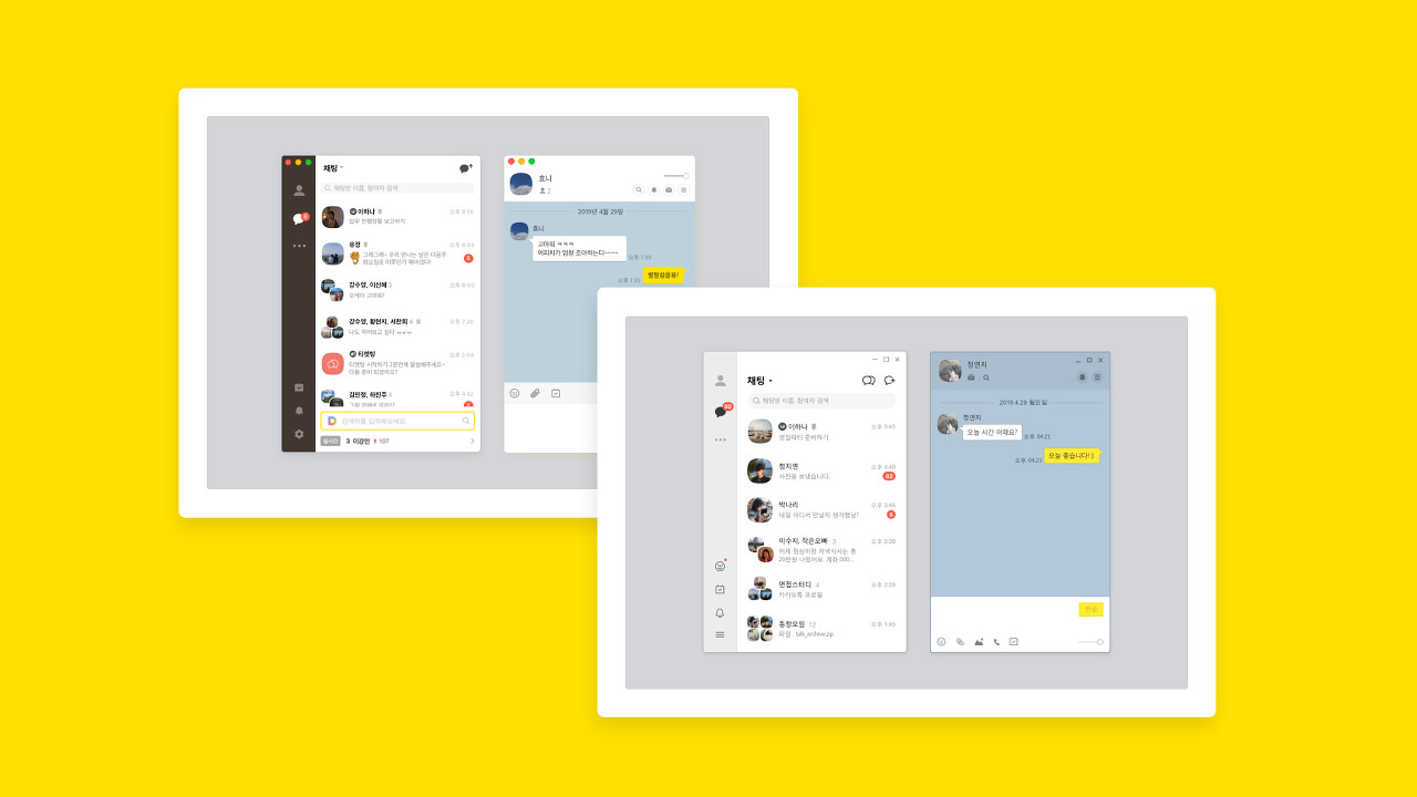 위 화면이 PC 버젼입니다. 왼쪽은 맥북 실행화면, 오른쪽은 윈도우 실행화면입니다. 카카오톡의 편리한 기능을 PC에서도 그대로 적용되어, 다양한 파일을 최대 300MB까지 전송하는 것은 물론, 백업/복원, 무료통화도 가능합니다.