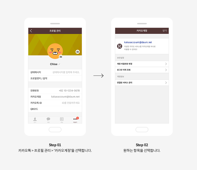 전혀 어렵지 않습니다. 스마트폰에 계정을 설정해두었으면 스마트폰의 카카오톡을 통해서 계정을 확인할 수 있습니다. 카카오톡에서는 아래와 같이 계정을 관리할 수 있어요.