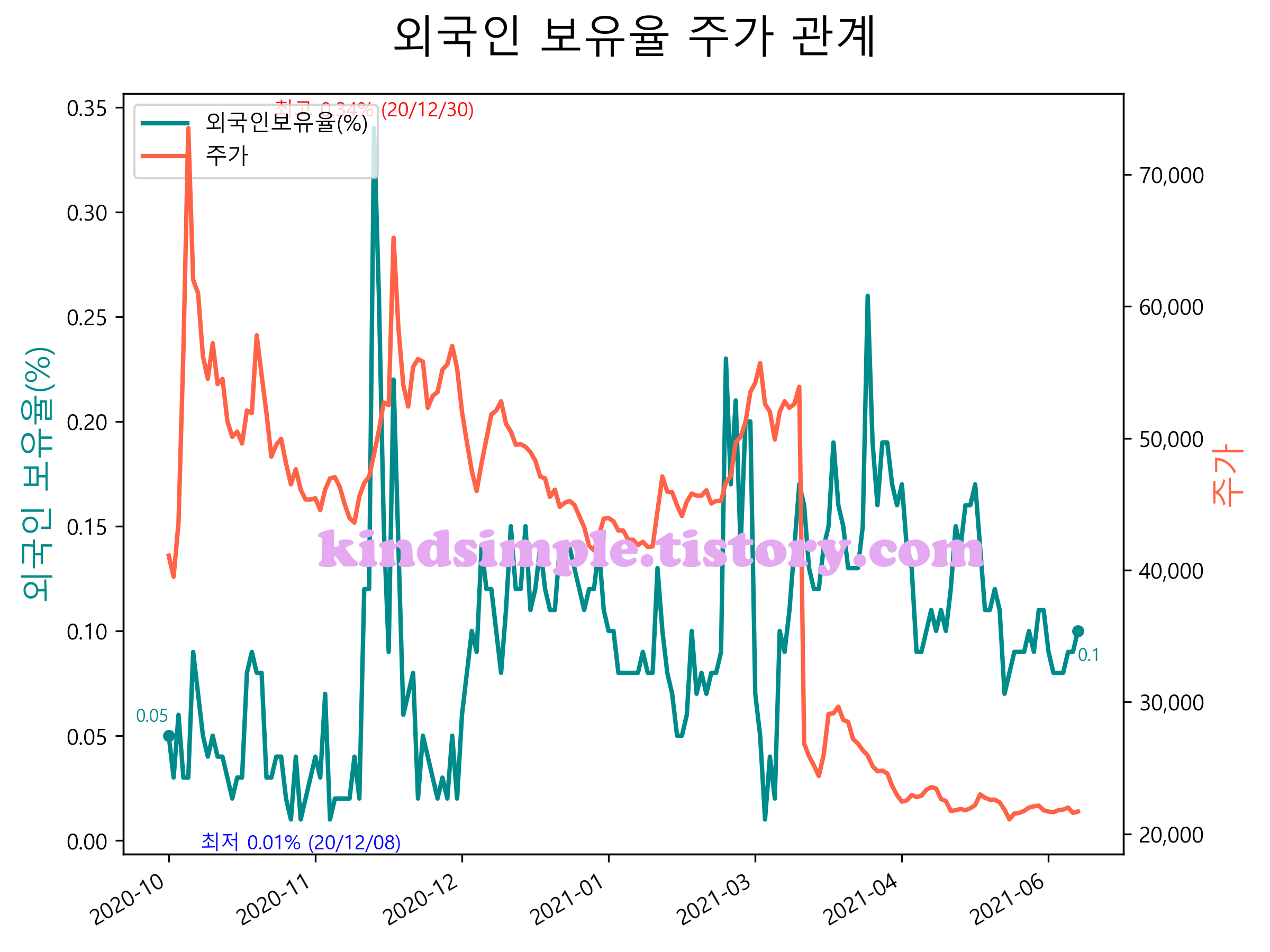 최근 1년간 외국인 보유율 및 주가와의 관계입니다.