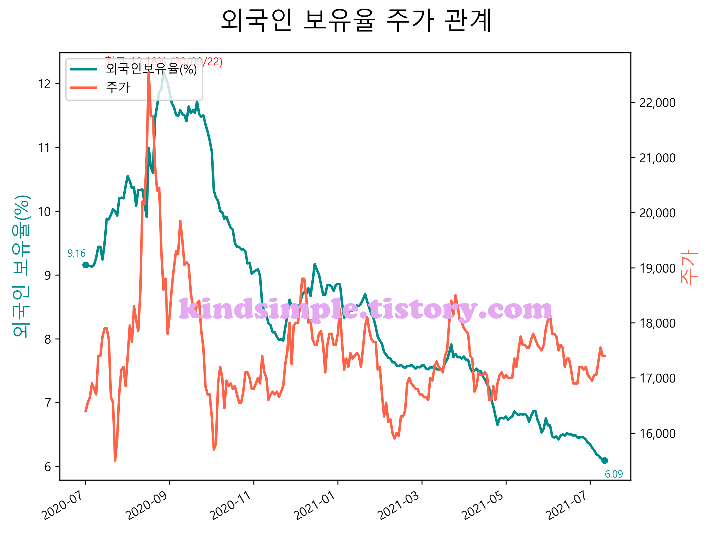 최근 1년간 외국인 보유율 및 주가와의 관계입니다.