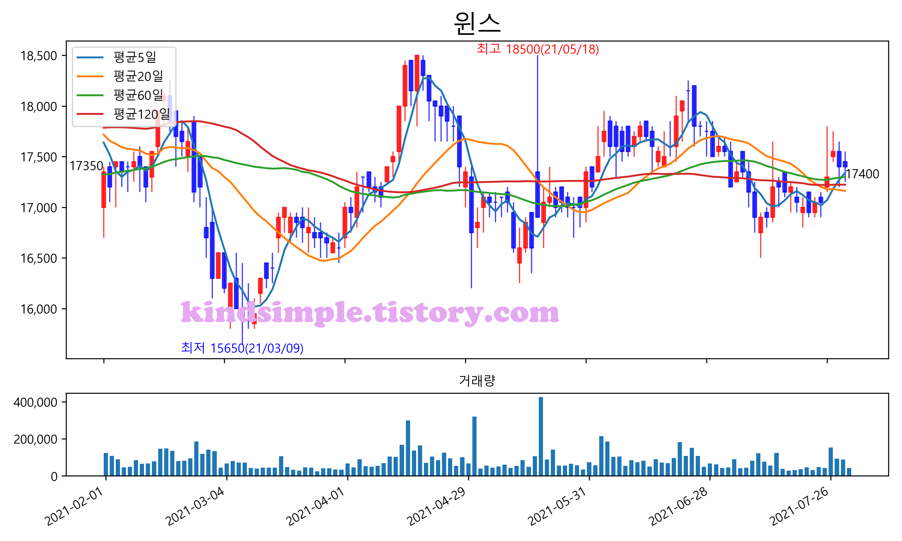 최근 6개월간 캔들차트 및 이동평균선입니다.