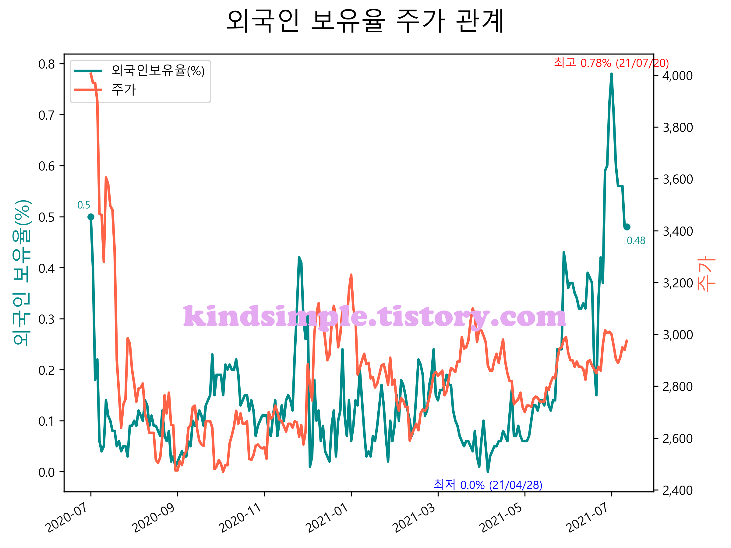 최근 1년간 외국인 보유율 및 주가와의 관계입니다.