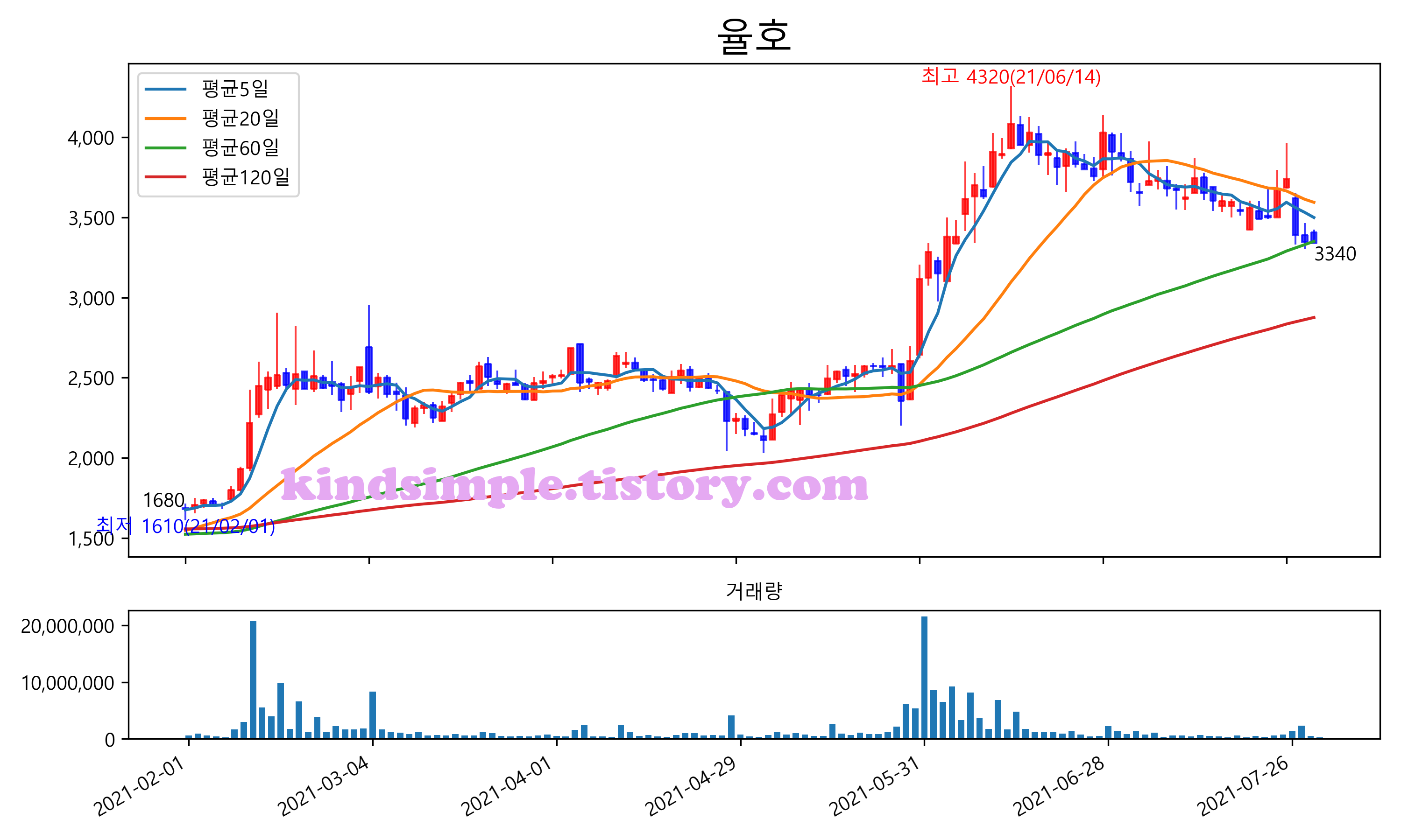 최근 6개월간 캔들차트 및 이동평균선입니다.