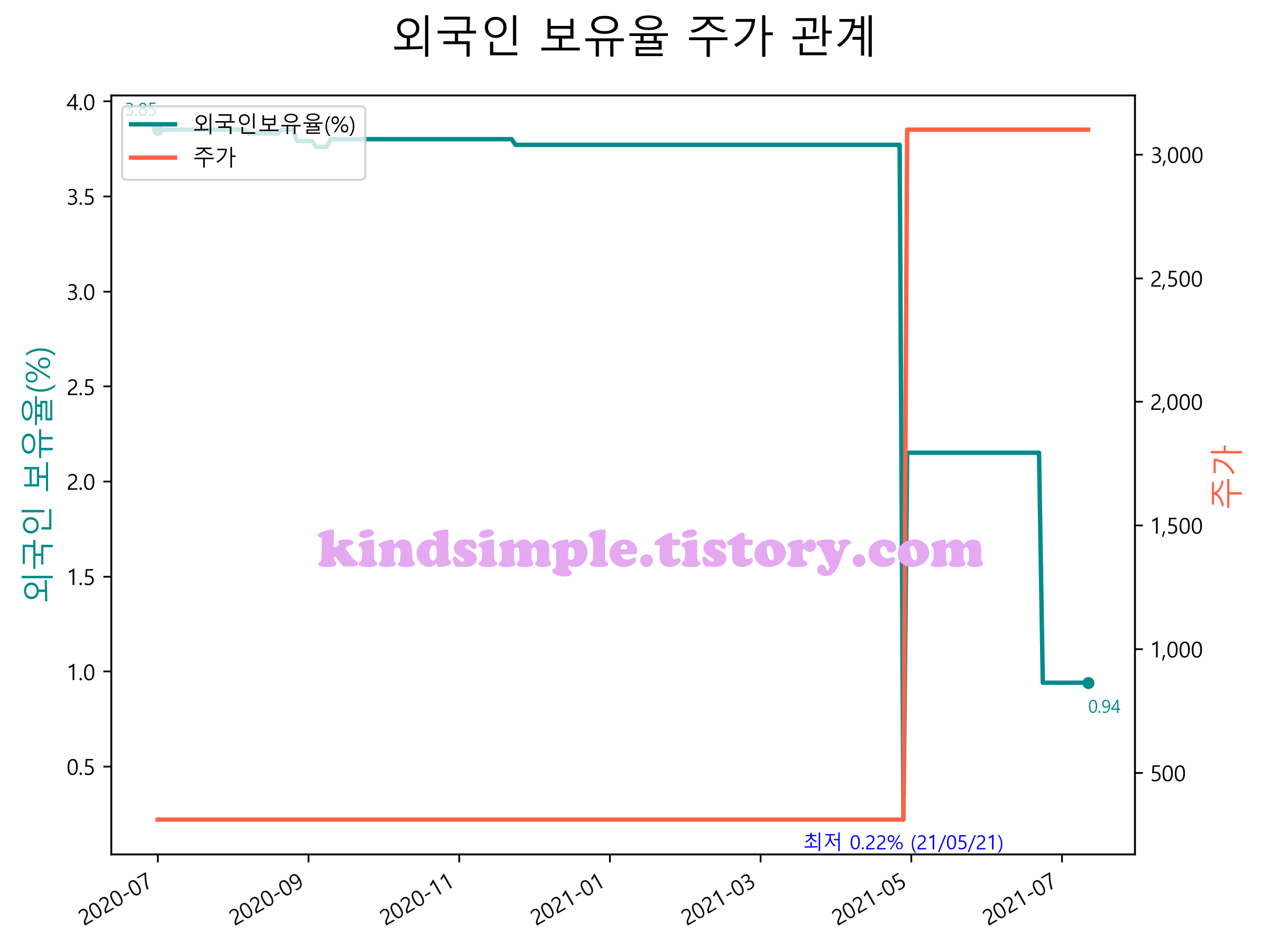 최근 1년간 외국인 보유율 및 주가와의 관계입니다.
