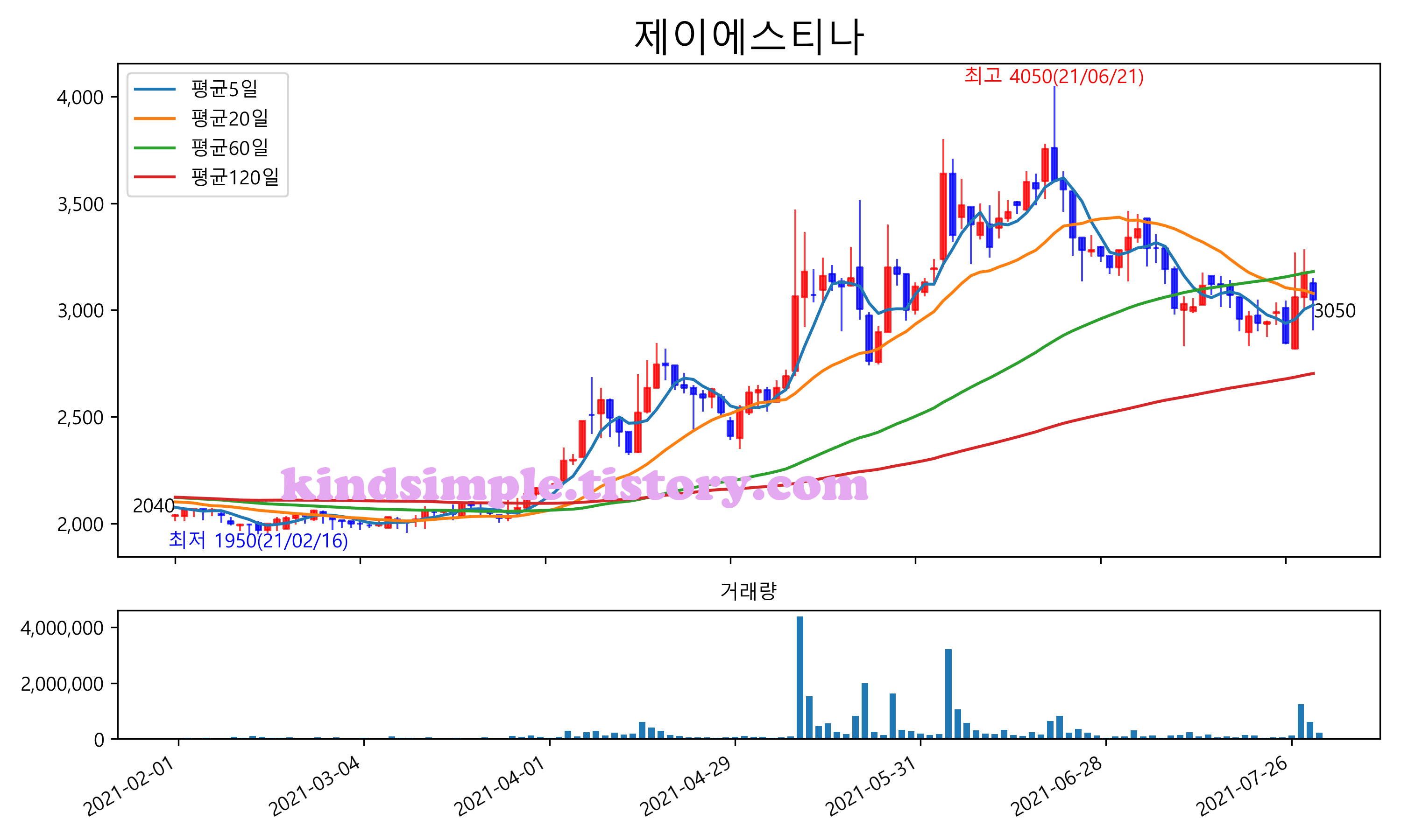 최근 6개월간 캔들차트 및 이동평균선입니다.