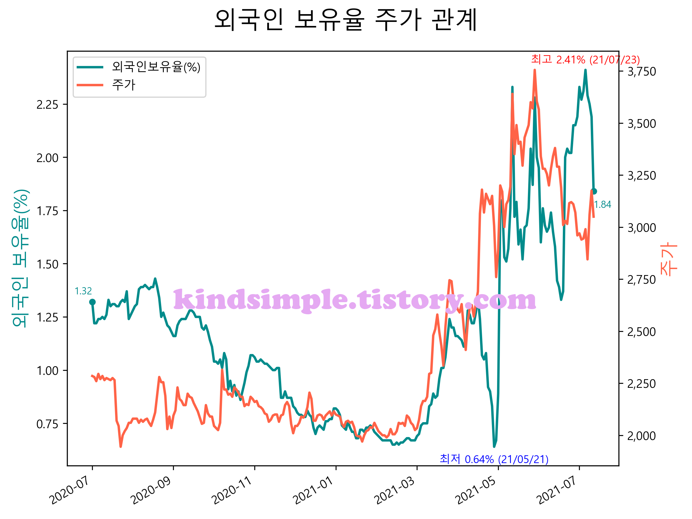 최근 1년간 외국인 보유율 및 주가와의 관계입니다.