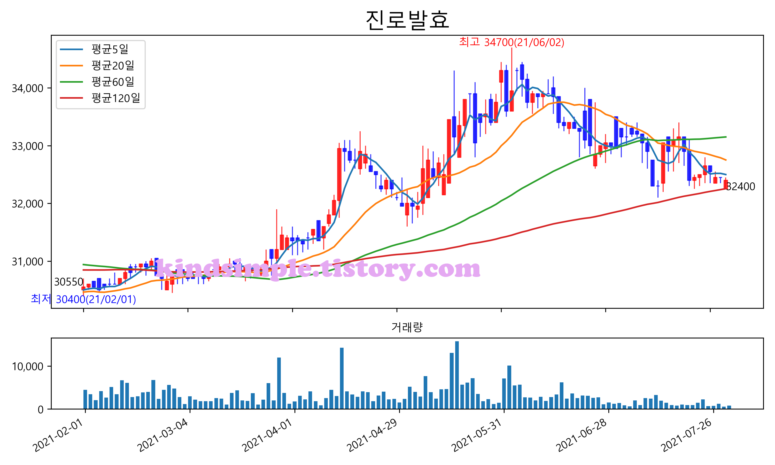 최근 6개월간 캔들차트 및 이동평균선입니다.
