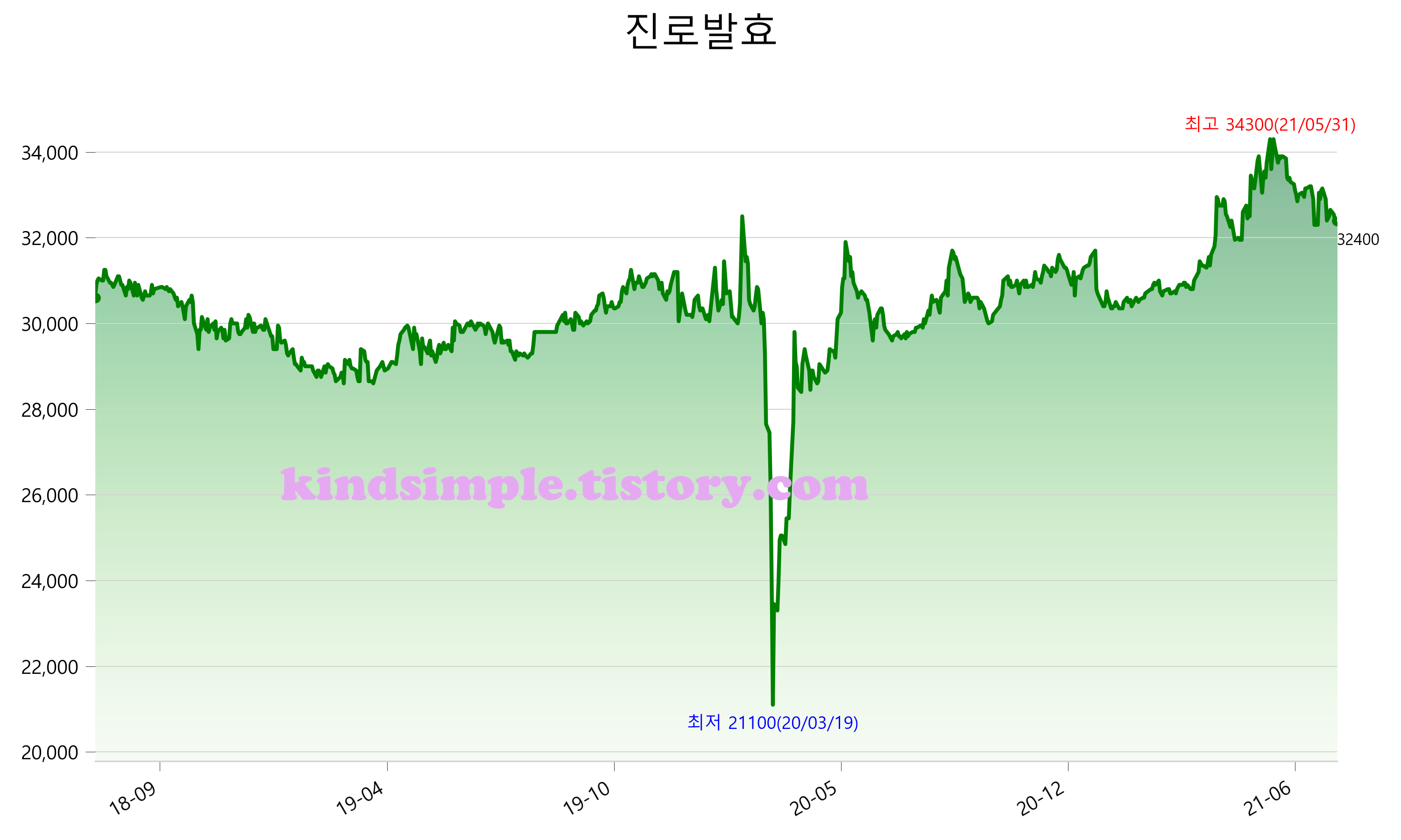 7월 29일 기준 주가는 32,400원 입니다. 아래는 최근 3년간의 주가흐름입니다.