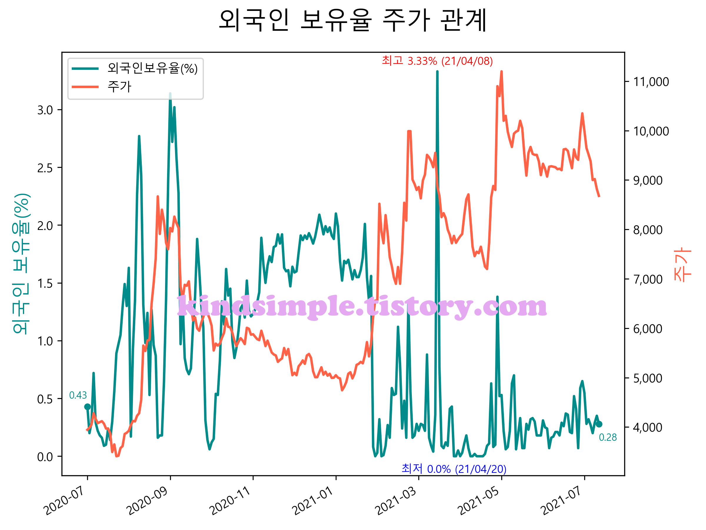 최근 1년간 외국인 보유율 및 주가와의 관계입니다.