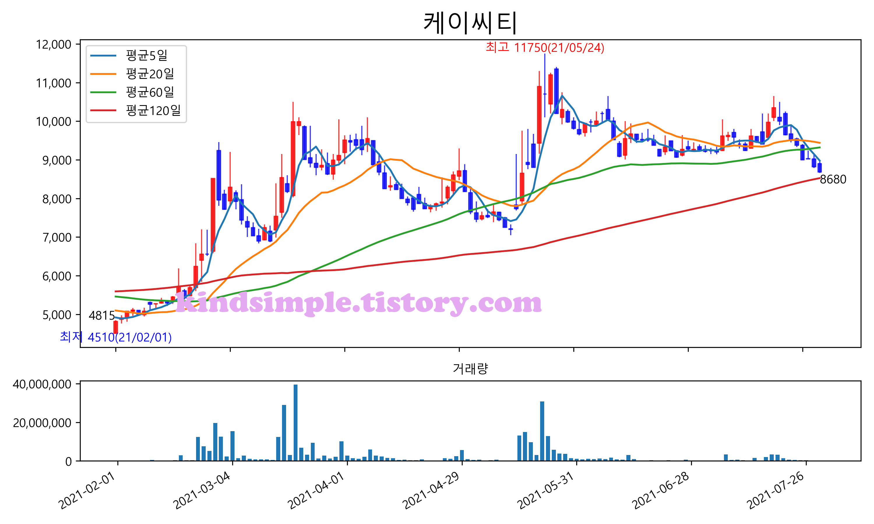 최근 6개월간 캔들차트 및 이동평균선입니다.