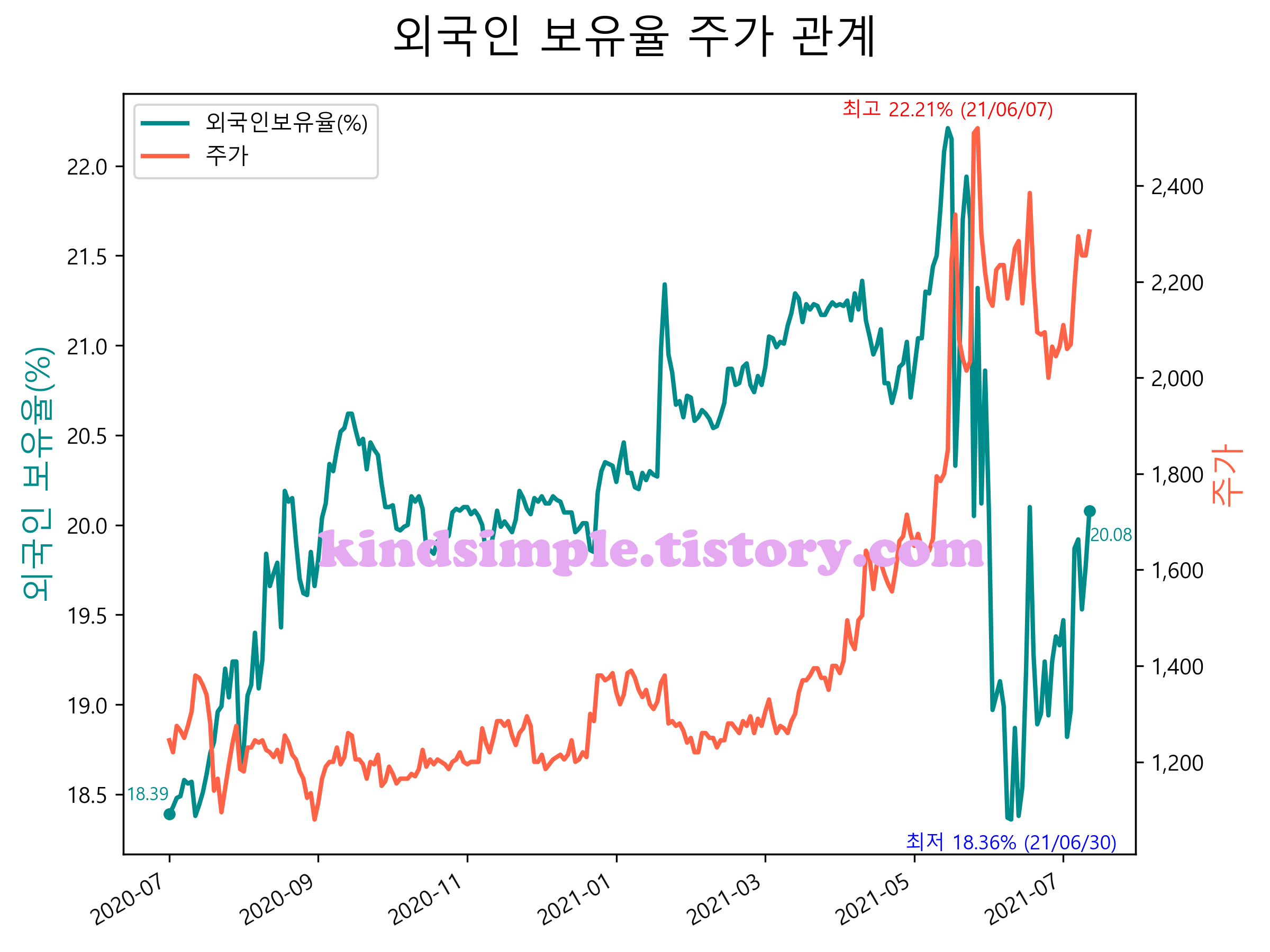 최근 1년간 외국인 보유율 및 주가와의 관계입니다.