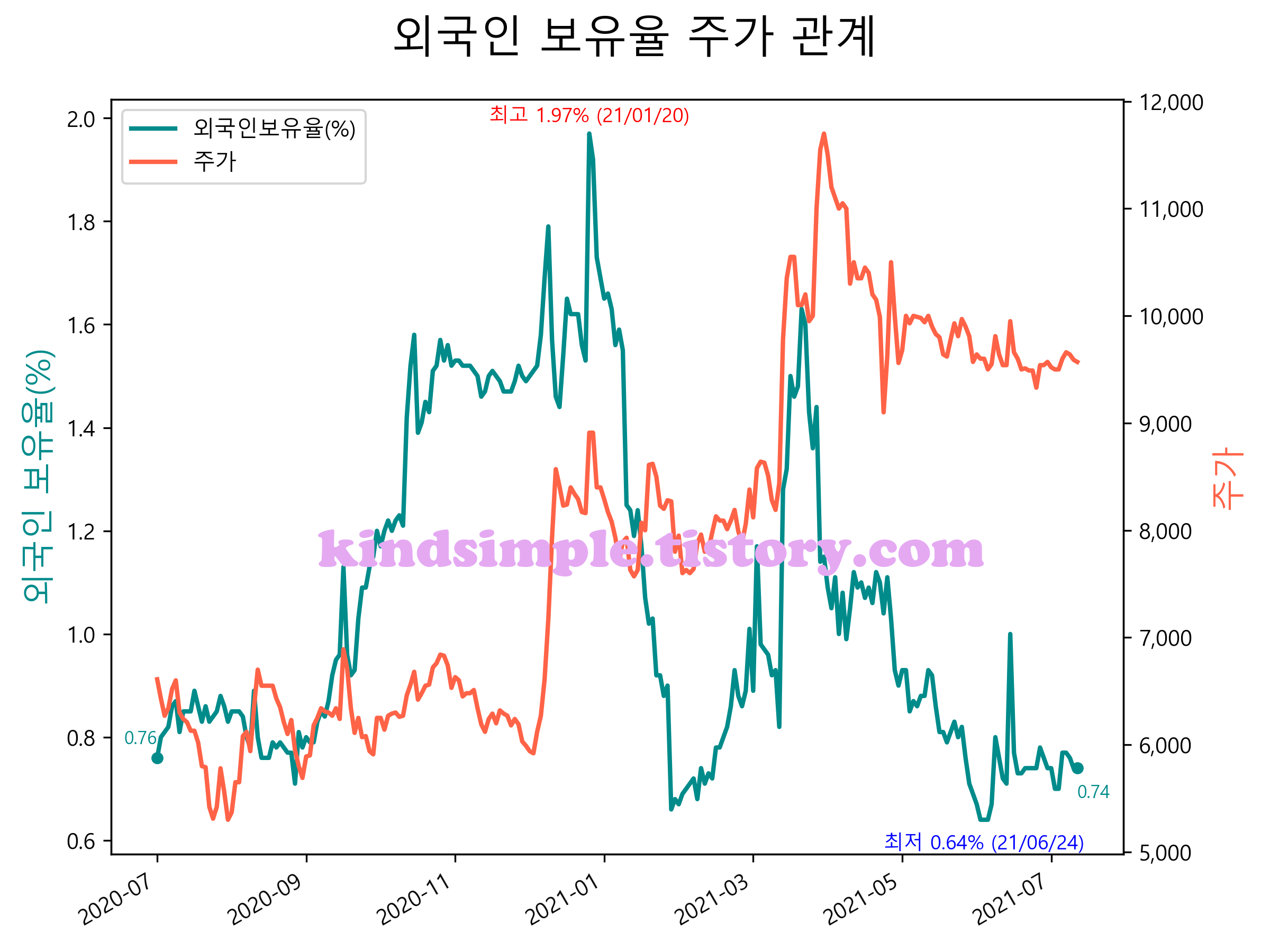 최근 1년간 외국인 보유율 및 주가와의 관계입니다.