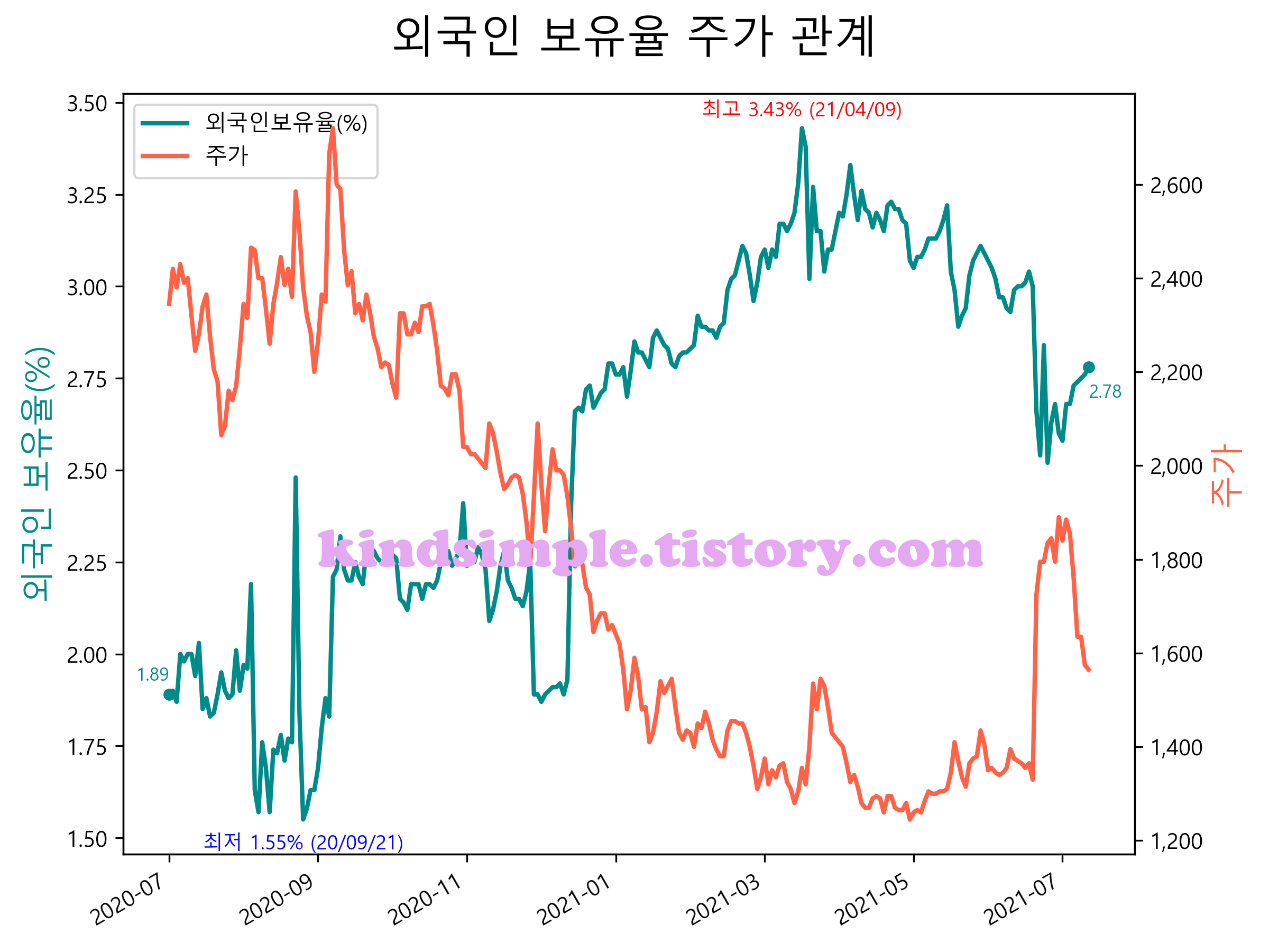 최근 1년간 외국인 보유율 및 주가와의 관계입니다.